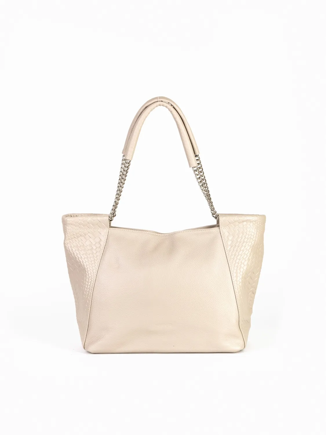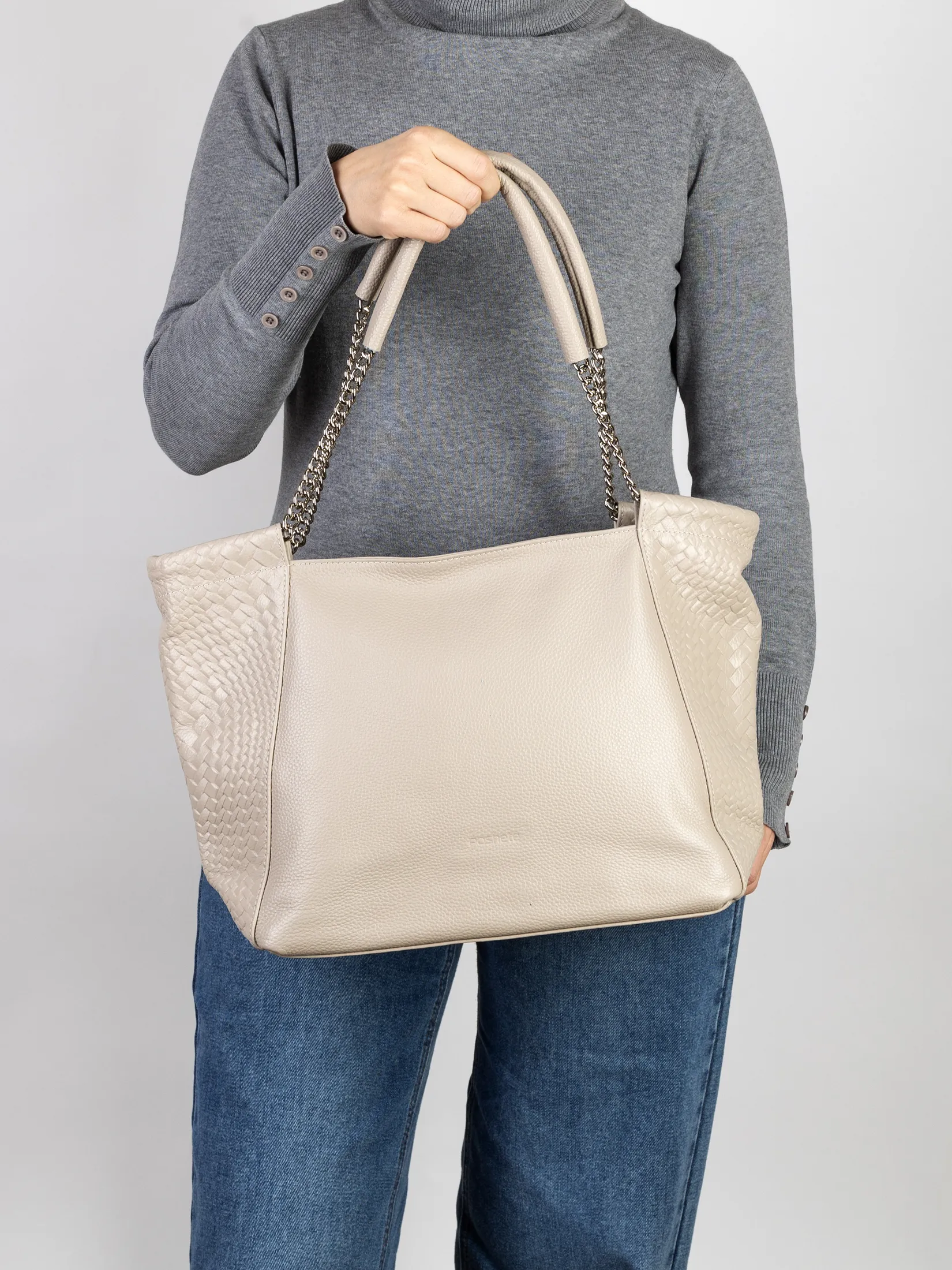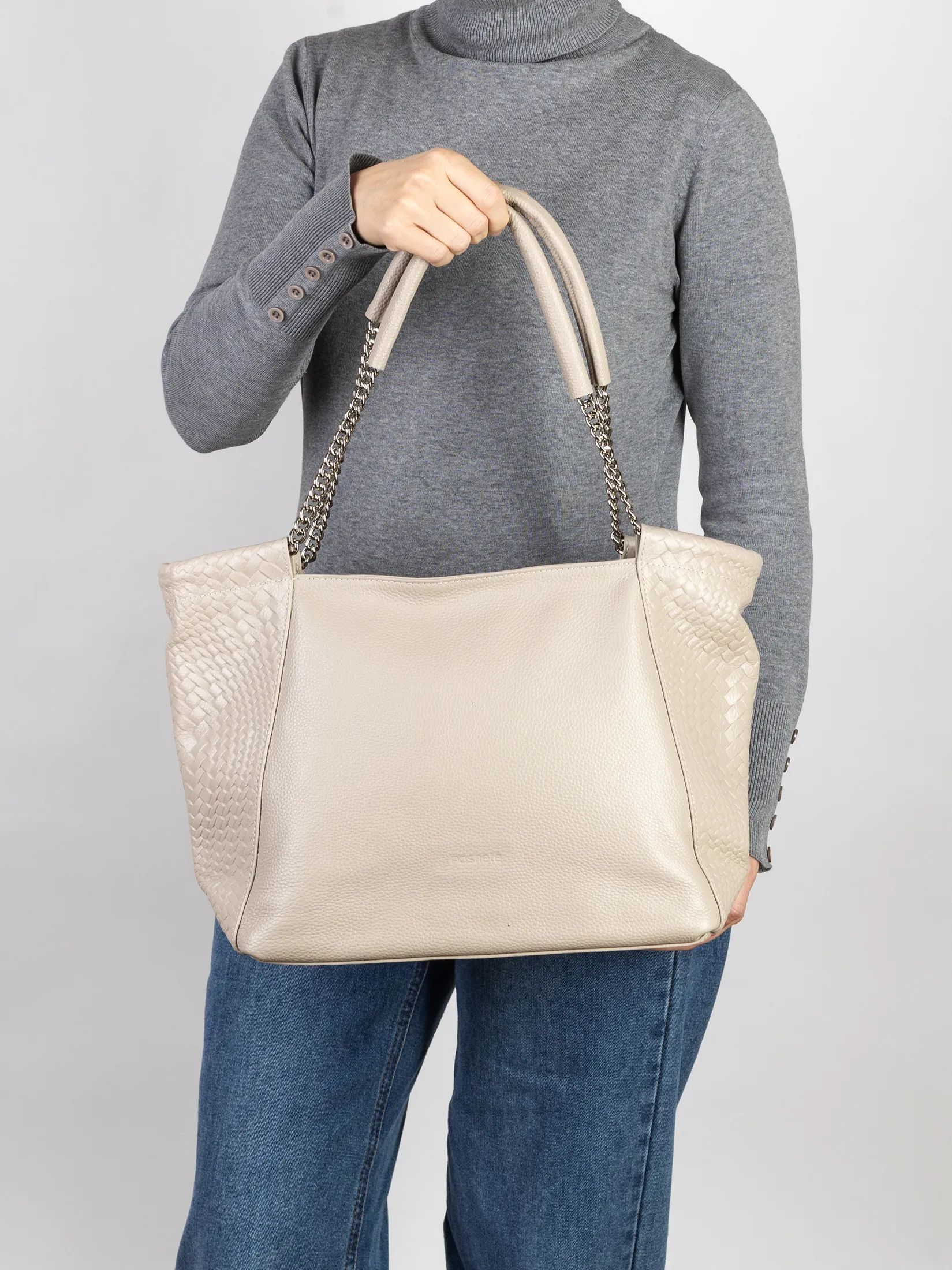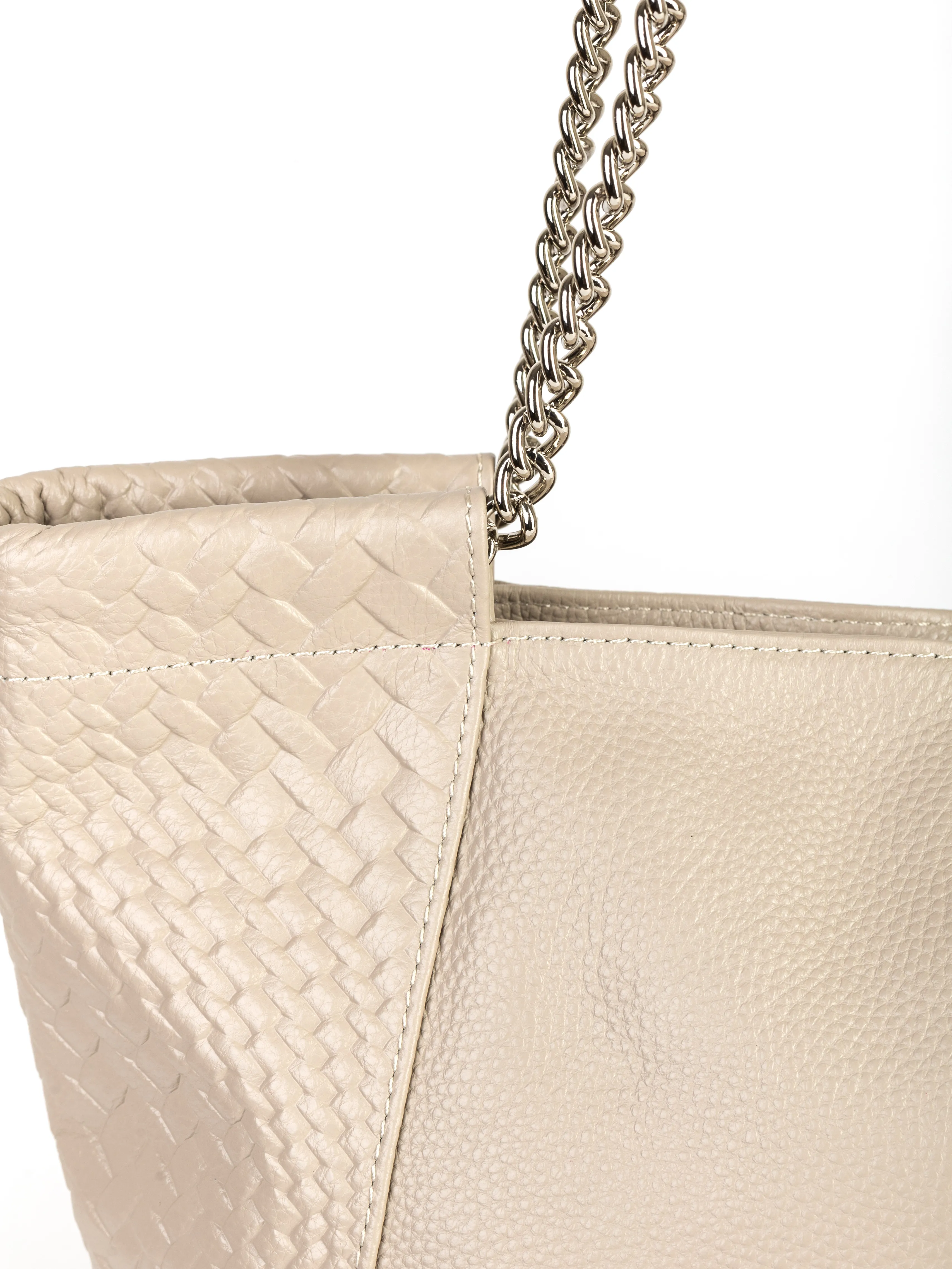 Сумка от бренда Poshete из натуральной кожи светло-кофейного цвета. Вместительная модель с двумя удлиненными ручками-цепочками. Отделение на молнии. Внутри: фирменная подкладка, средник и карман на молнии, два накладных кармана. По бокам декорирована оригинальным тиснением под плетение.
