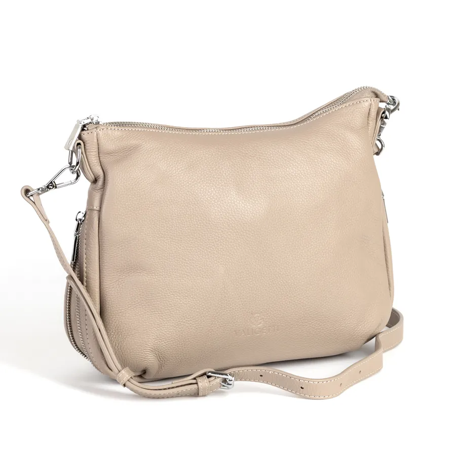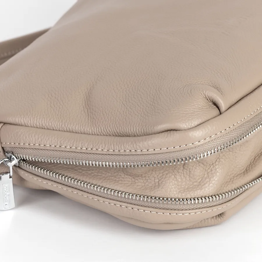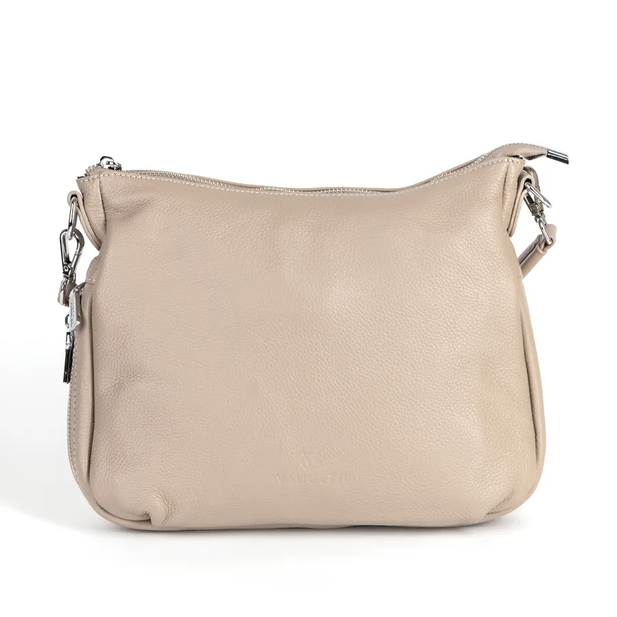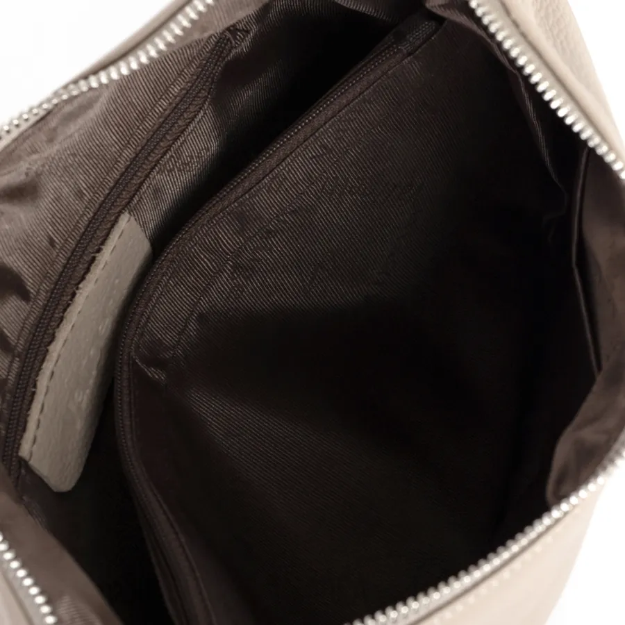 Сумка кросс-боди от бренда Valigetti выполнена из натуральной кожи в бежевом цвете. Модель со съемным регулируемым плечевым ремнем и съемной ручкой. Основное отделение на молнии, внутри: фирменная текстильная подкладка, накладной открытый карман, средний карман, боковой карман на молнии. На задней стороне сумки расположен карман быстрого доступа на молнии. Также сумка имеет расширение на молнии для увеличения объема.