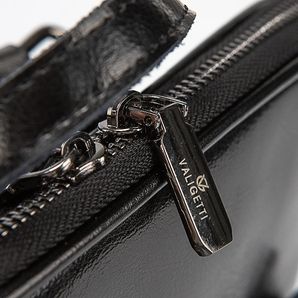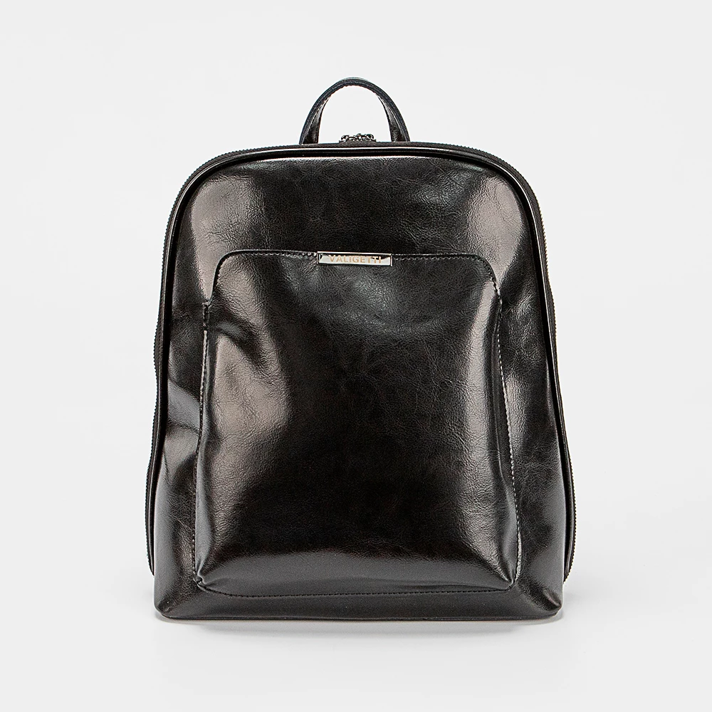Сумка-рюкзак от бренда Valigetti выполнена из натуральной кожи черного цвета. Модель с лямкой-переноской и регулируемыми плечевыми лямками, которые стягиваются в плечевой ремень. Отделение на молнии по трем сторонам, что обеспечивает комфортный доступ. Внутри: фирменная подкладка, перегородка, карман на молнии, два накладных кармана. На задней стороне – прорезной карман на молнии. На передней стороне – накладной карман на магнитной кнопке.