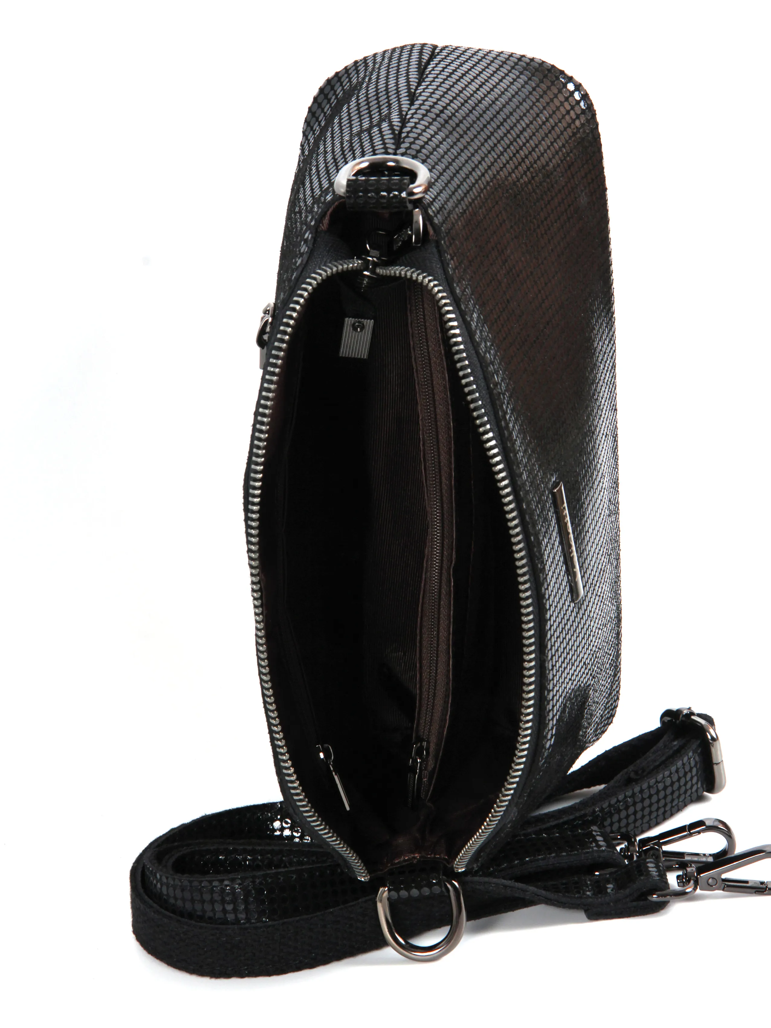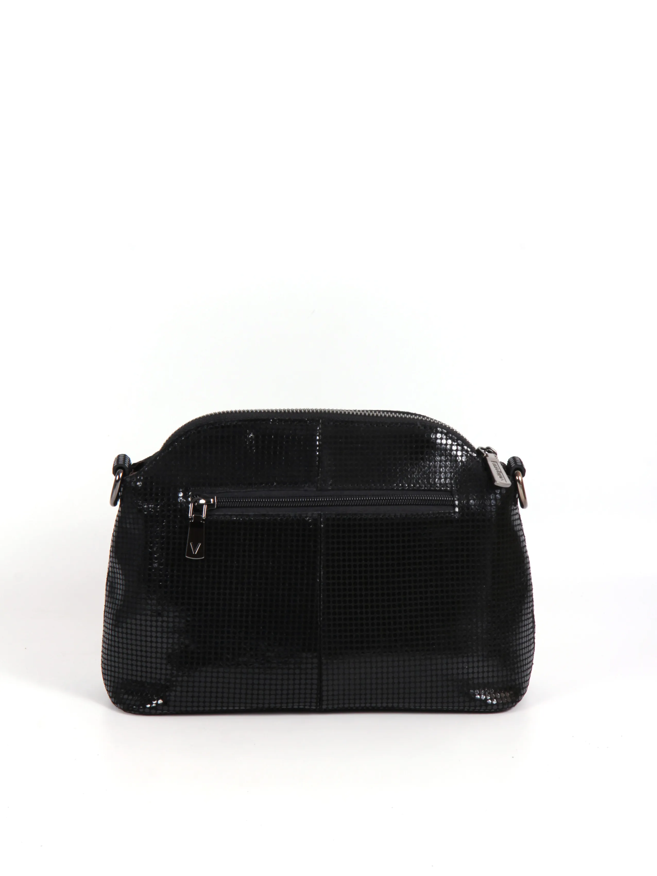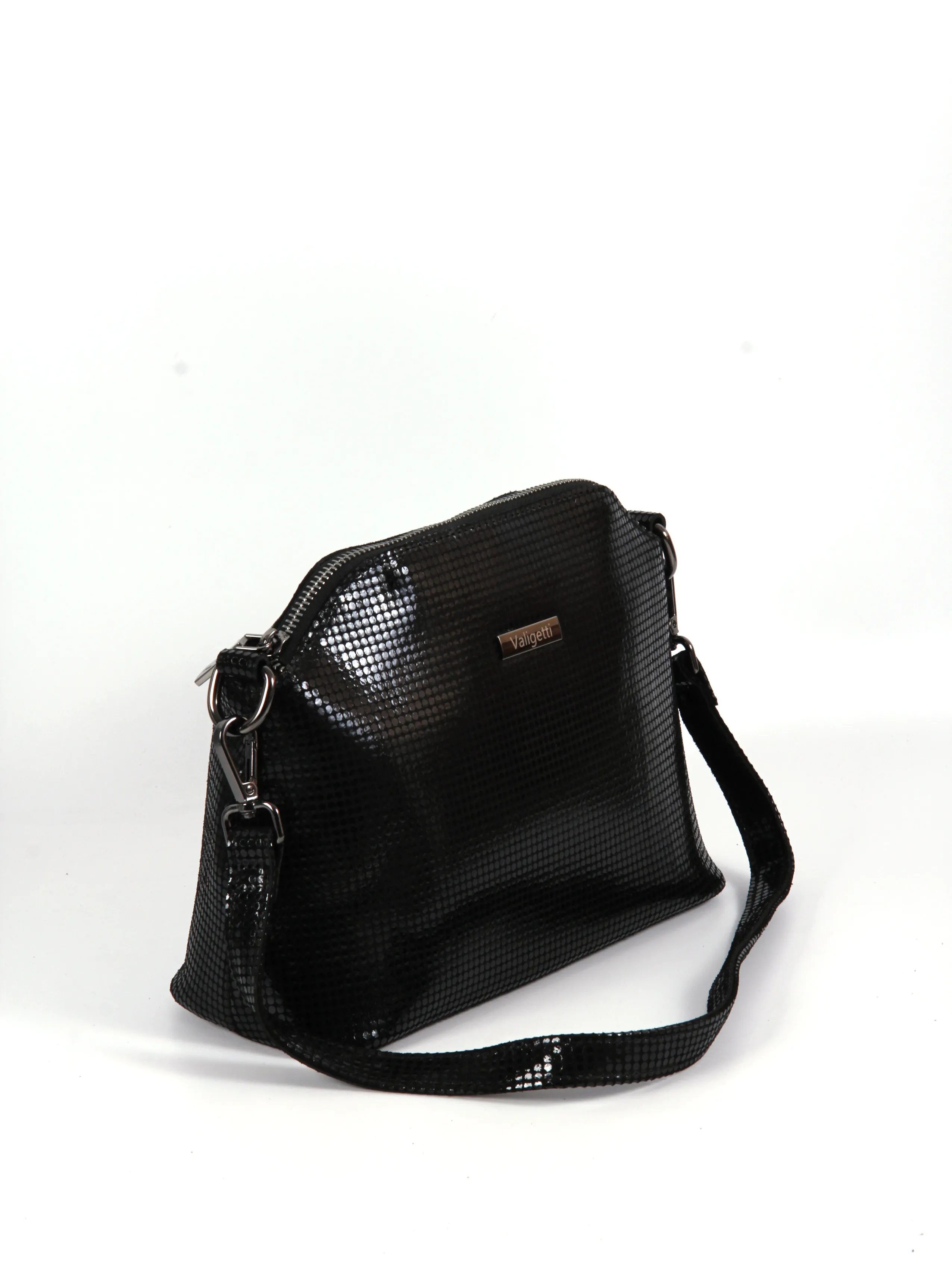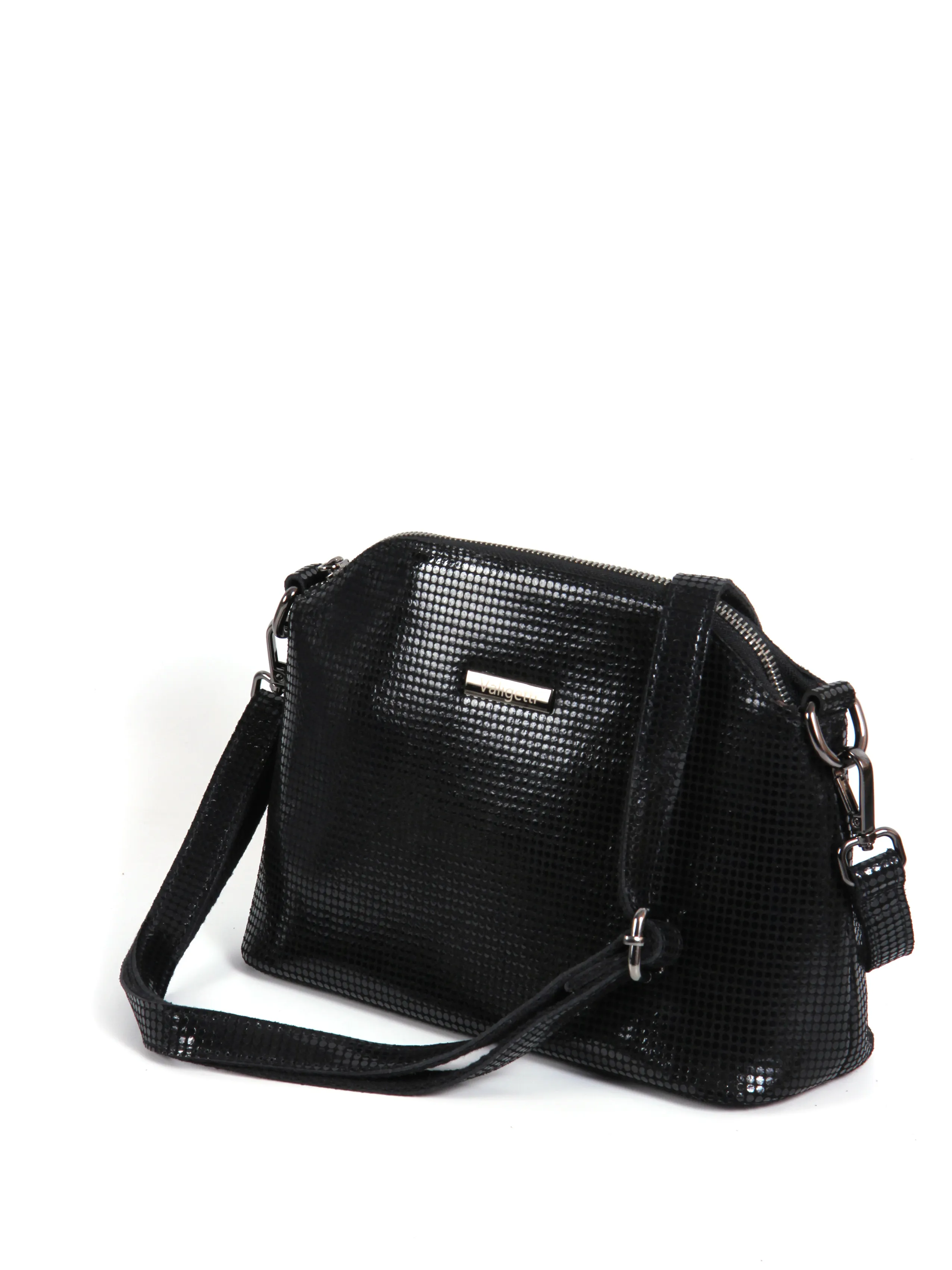 Сумка от бренда Valigetti выполнена из натуральной кожи черного цвета. Модель с удлиненной ручкой и длинным регулируемым плечевым ремнем. Отделение на молнии. Внутри: текстильная подкладка, карман и средник на молнии, накладной карман. На задней стороне — карман на молнии.