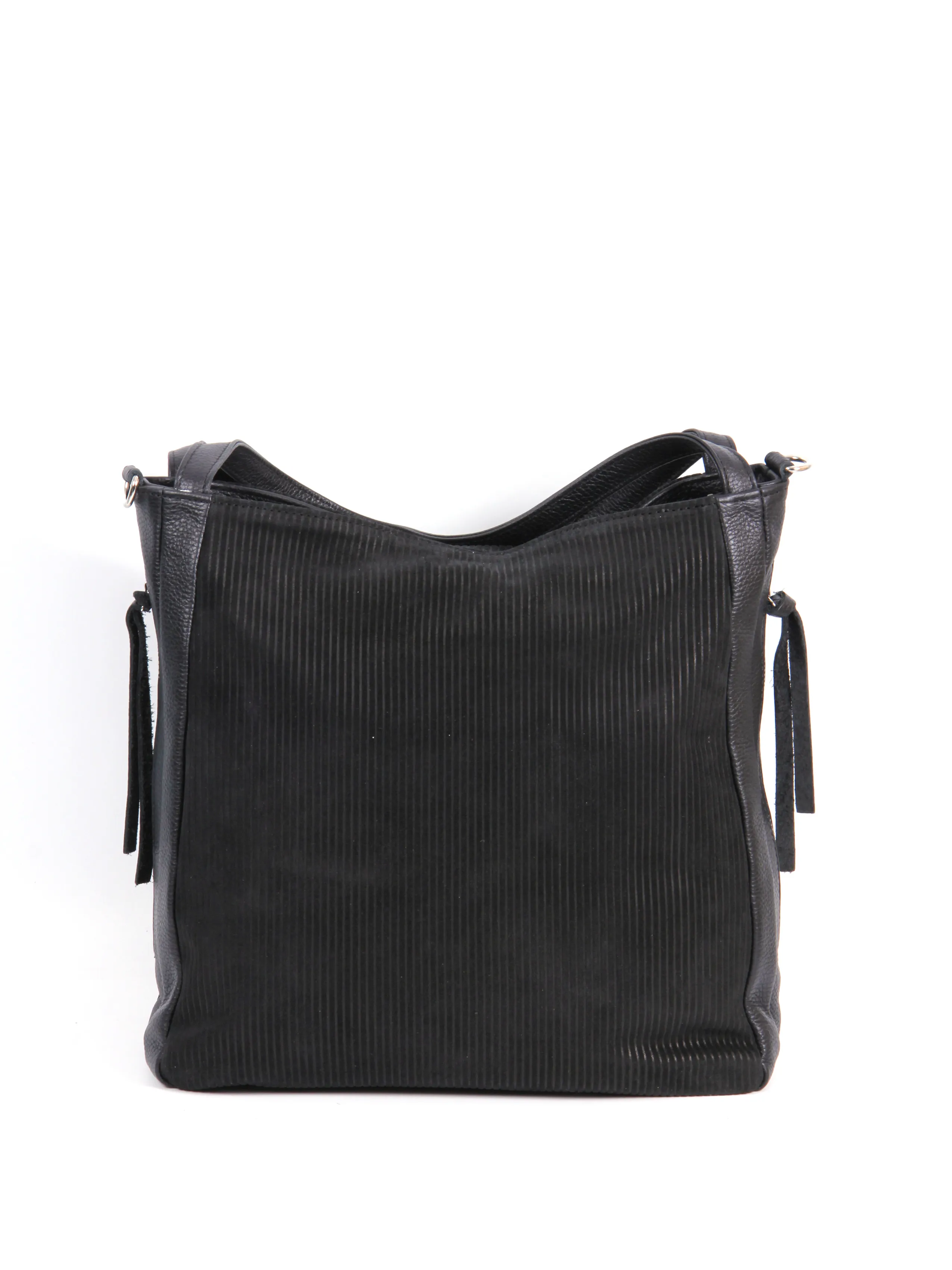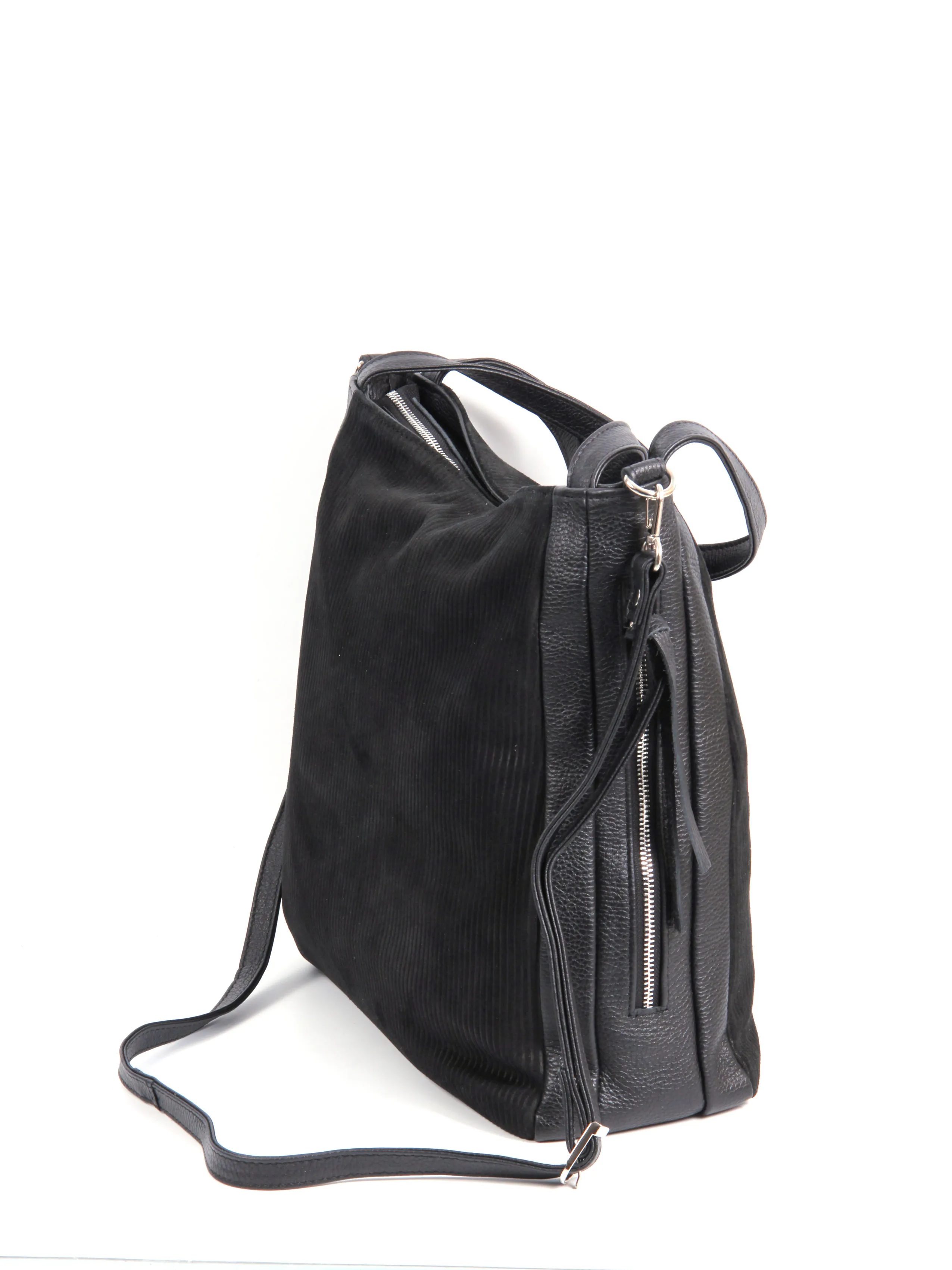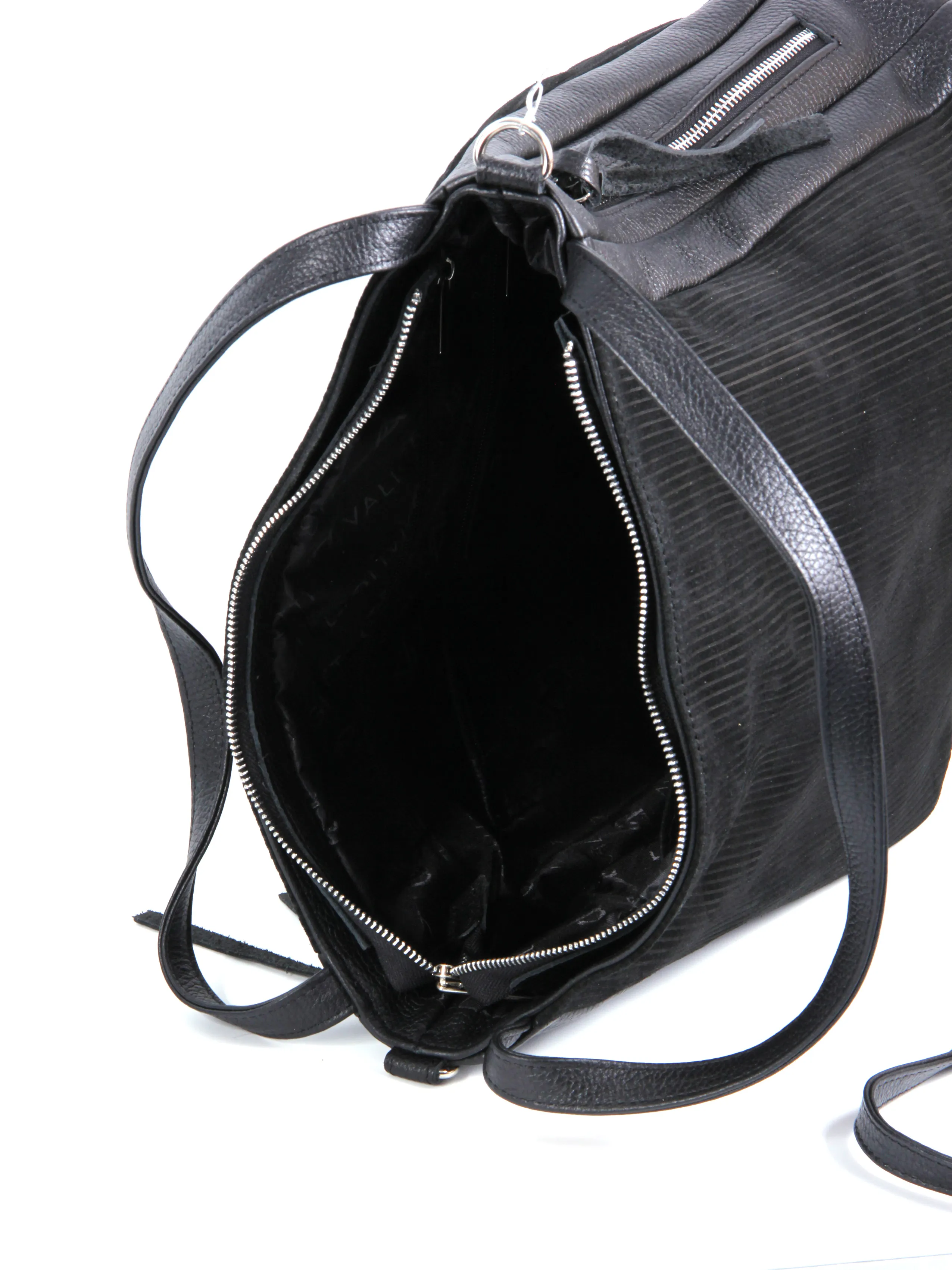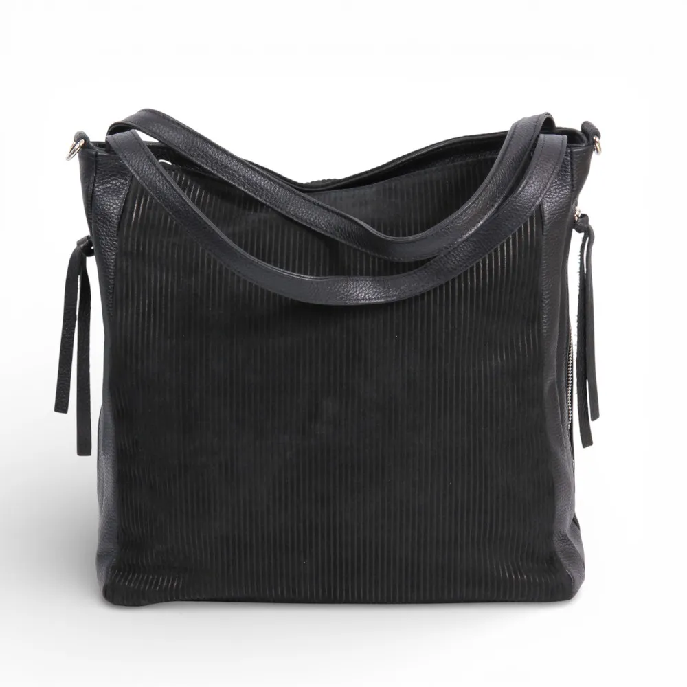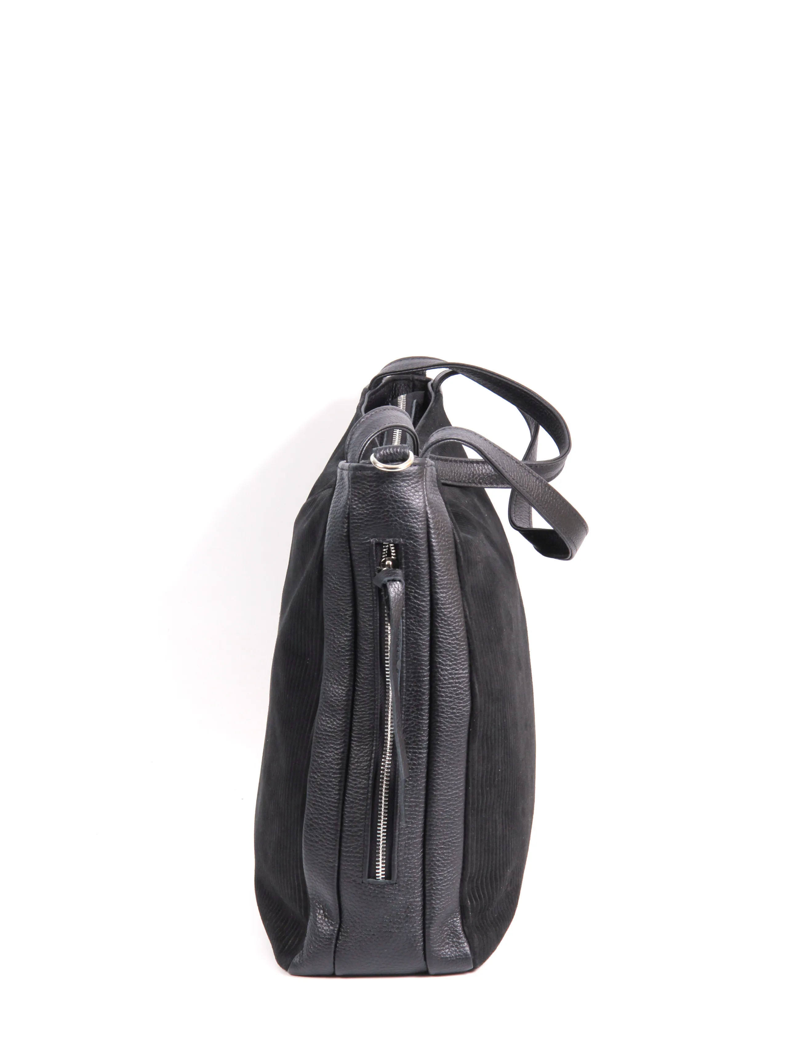 Сумка от бренда Valigetti выполнена из натуральной кожи и замши, выполнена в черном цвете. Модель с двумя короткими ручками и съемным регулируемым плечевым ремнем. Модель с одним отделением на молнии, внутри: текстильная фирменная подкладка, два боковых кармана на молнии и накладной открытый карман. По бокам расположено два кармана на молнии быстрого доступа.
