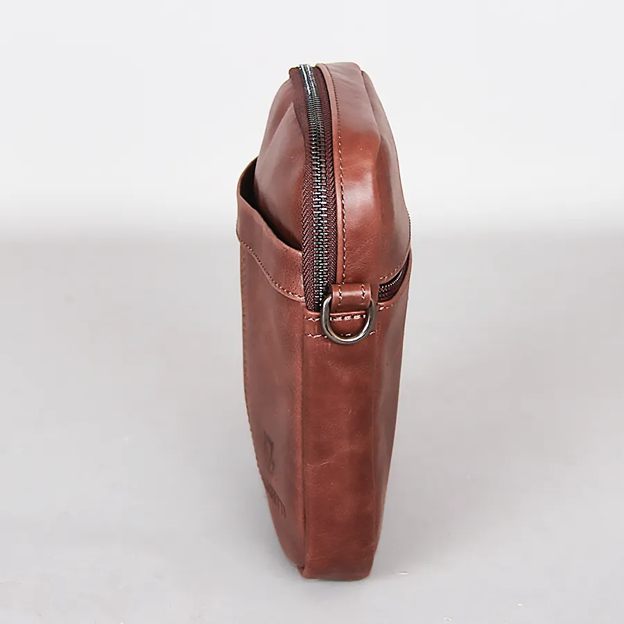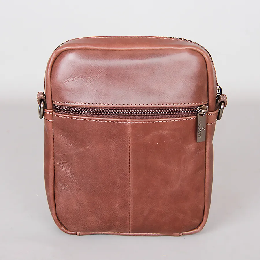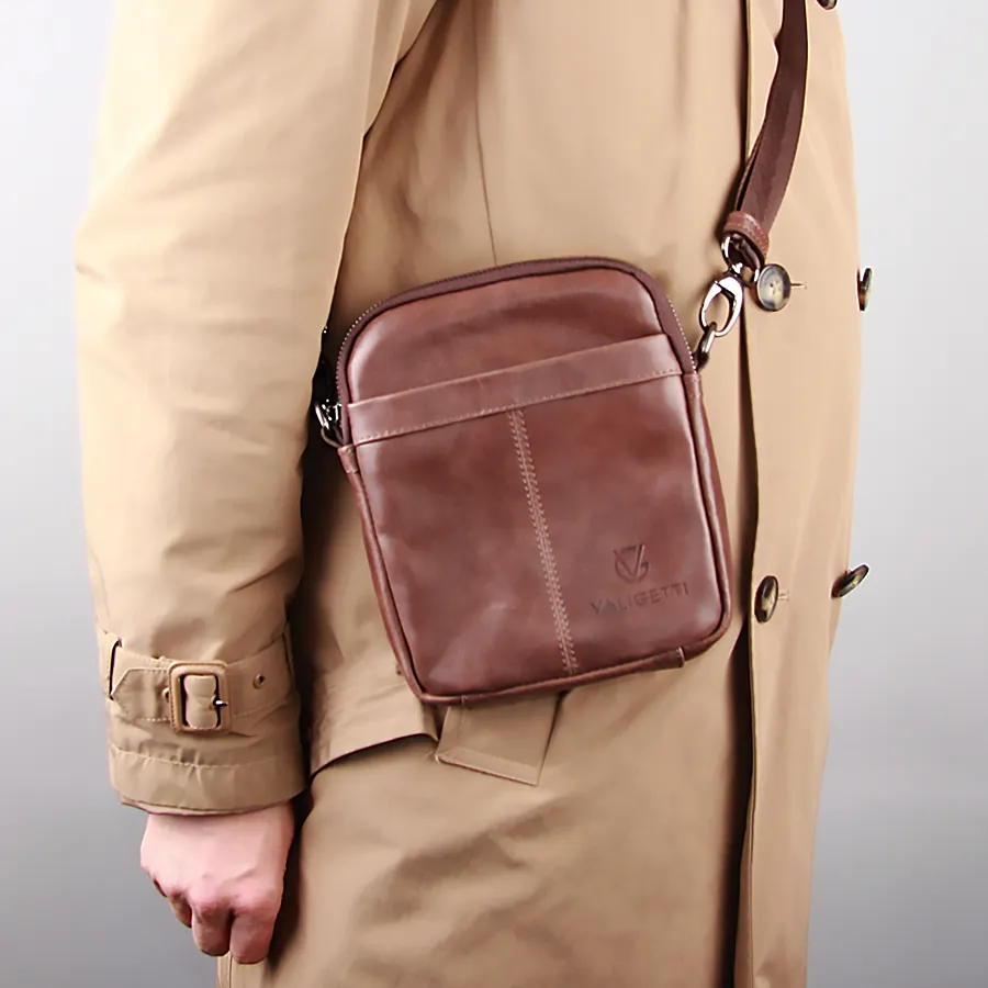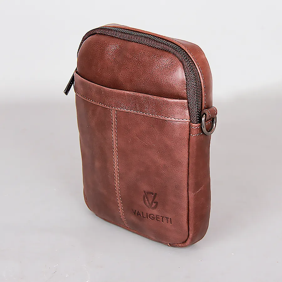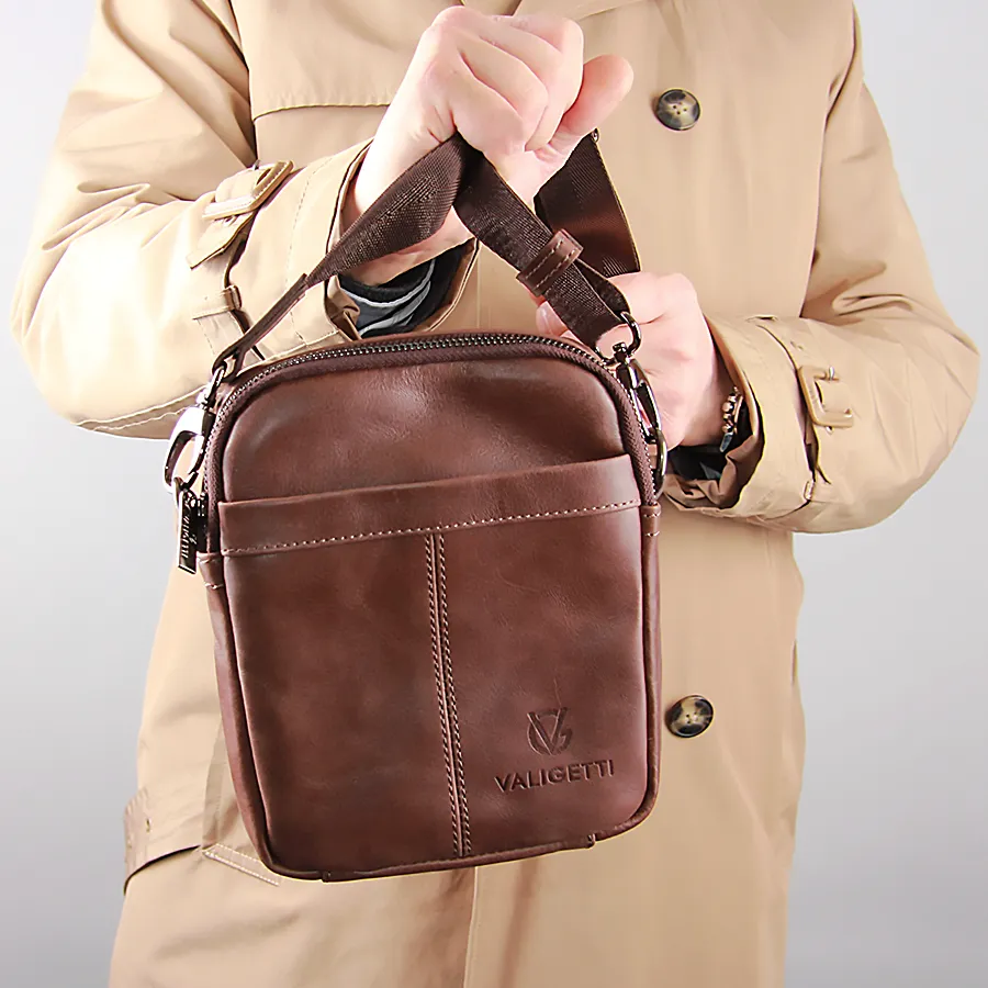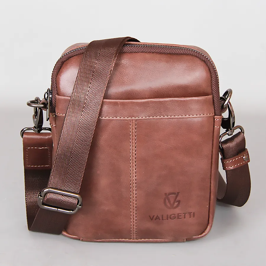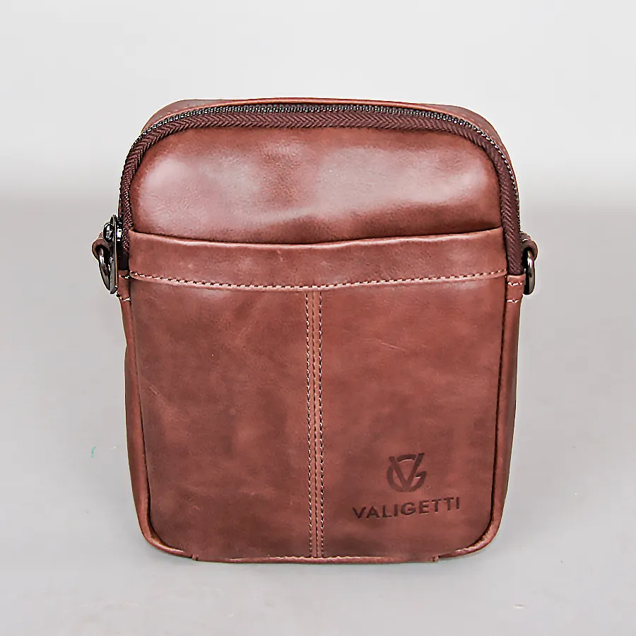 Стильная удобная мужская сумка из натуральной кожи от бренда Valigetti. На лицевой и задней сторонах есть прорезные карманы на молниях. Одно основное отдетение на молнии. Сумка носится через плечо на регулируемом плечевом ремне из текстиля. Цвет модели - коричневый.
