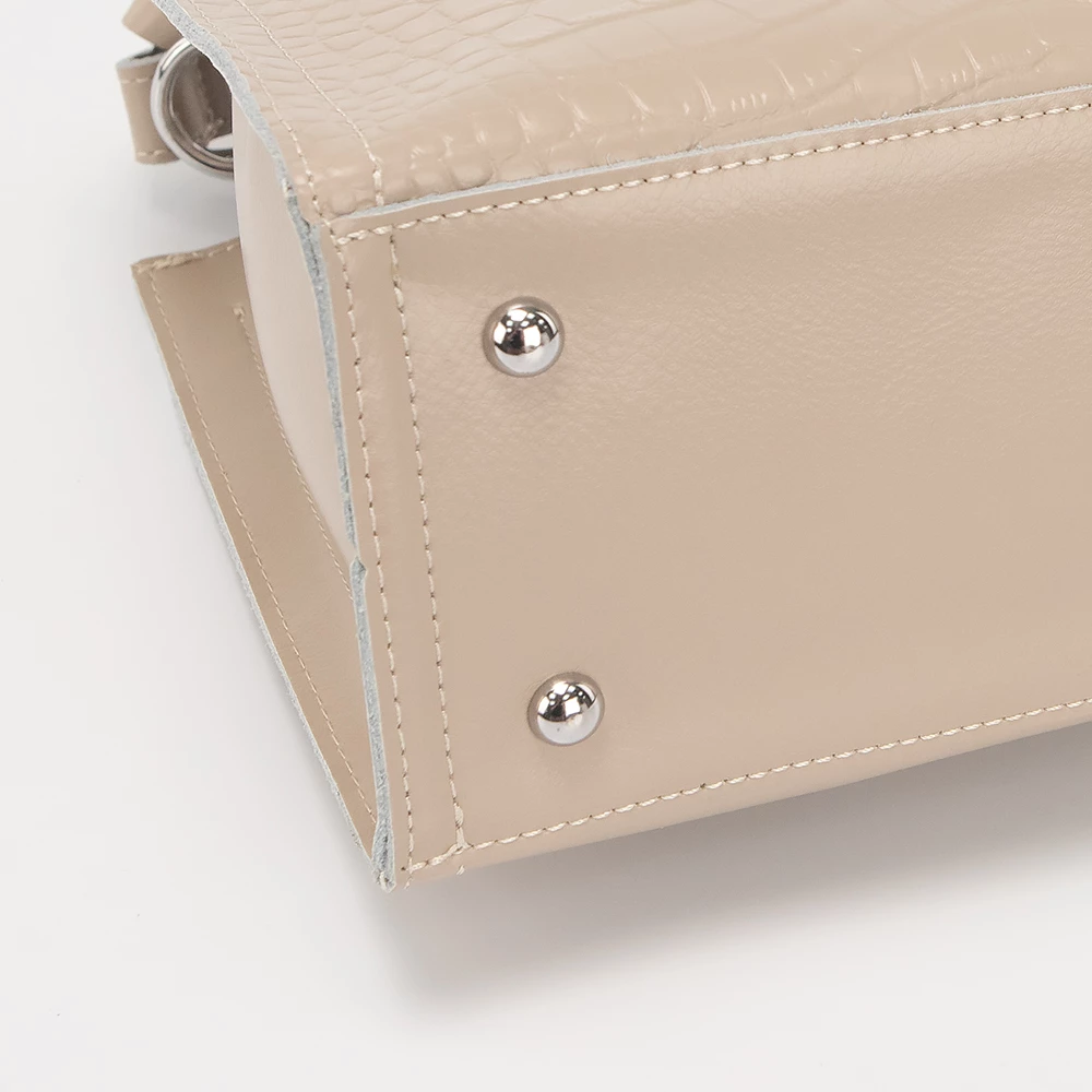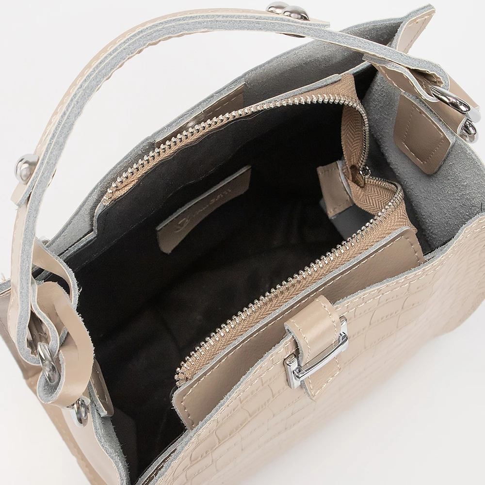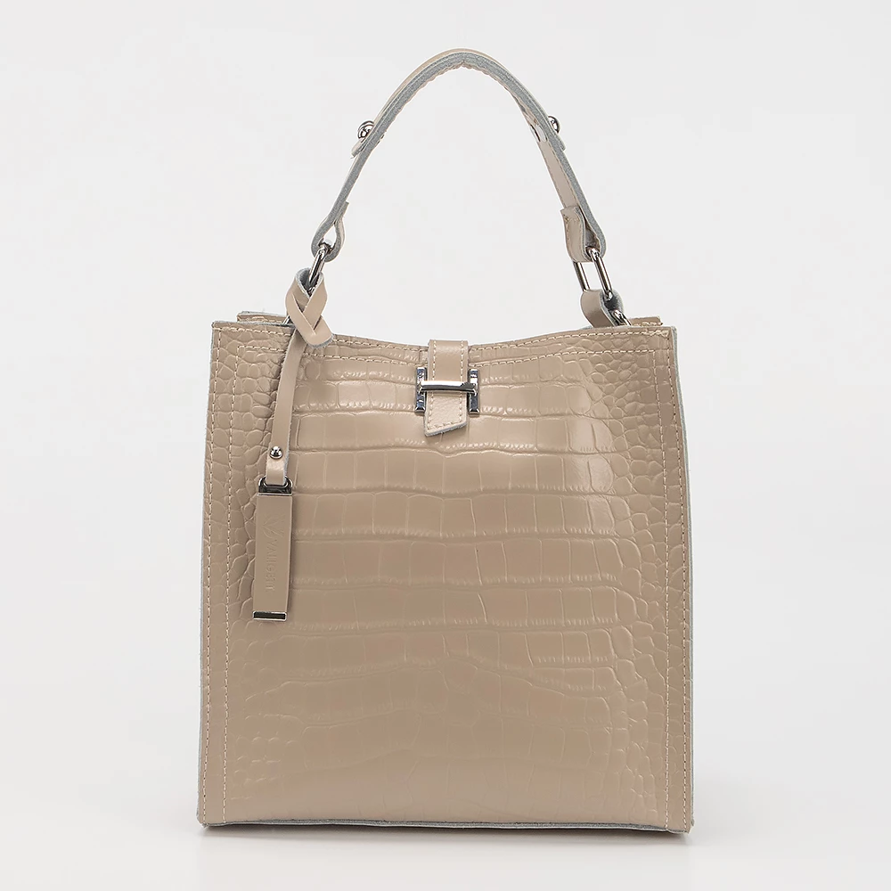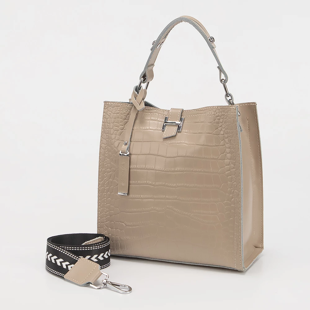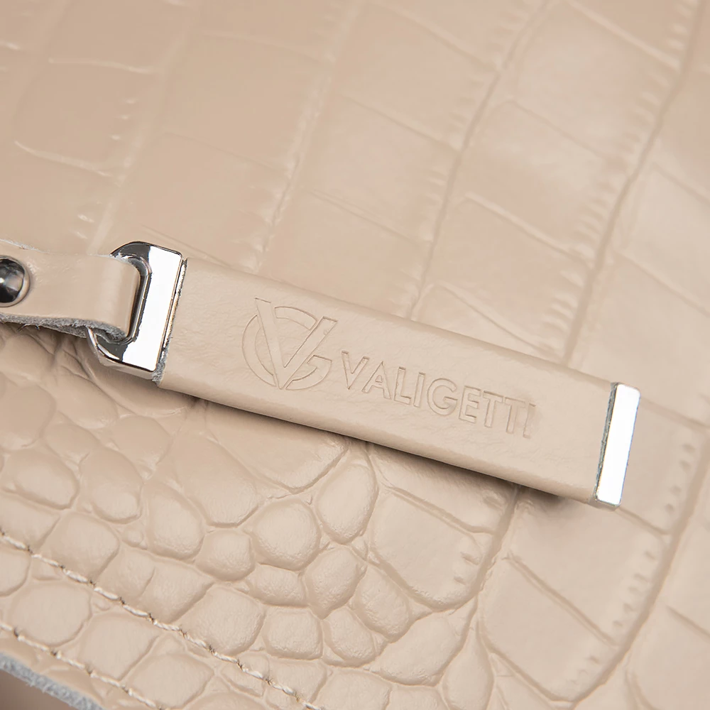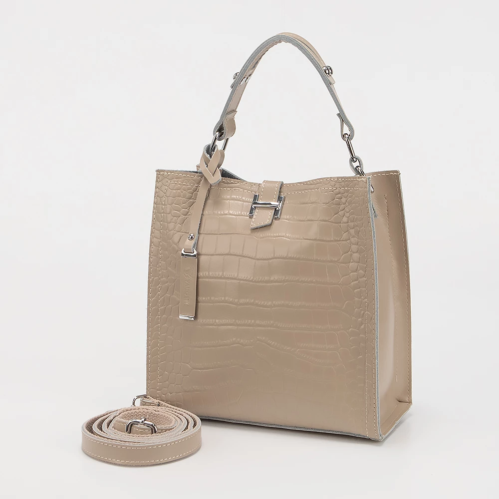 Сумка от бренда Valigetti из натуральной кожи кофейного цвета с тиснением под кожу крокодила. Компактная модель вертикальной ориентации с одной ручкой, съемным регулируемым плечевым кожаным ремнем и съемным нерегулируемым плечевым ремнем, выполненным из текстильного материала. Три отделения с частичной подкладкой. Крайние фиксируются магнитной кнопкой. Среднее отделение на молнии. Внутри: карман на молнии, два накладных кармана.