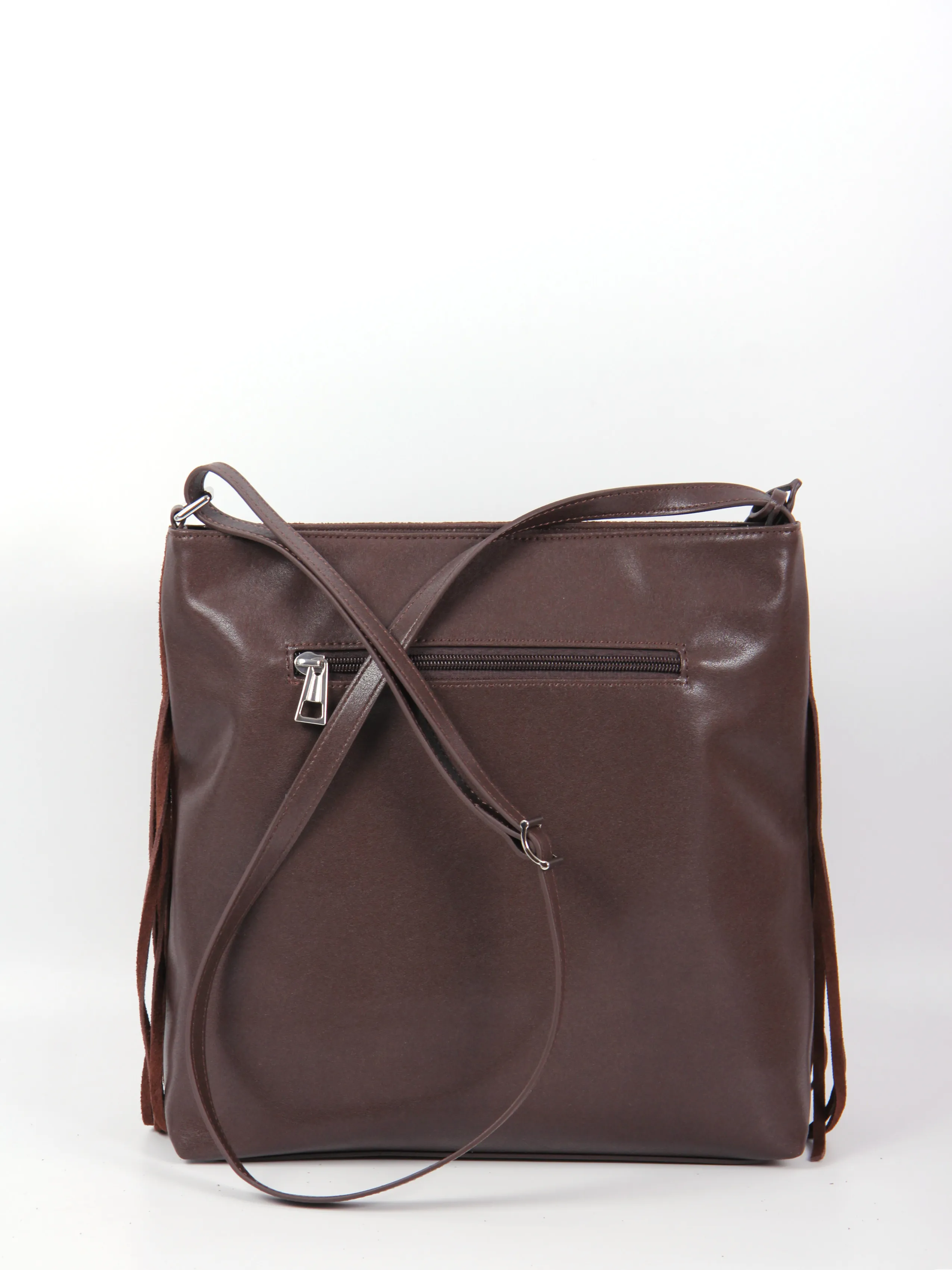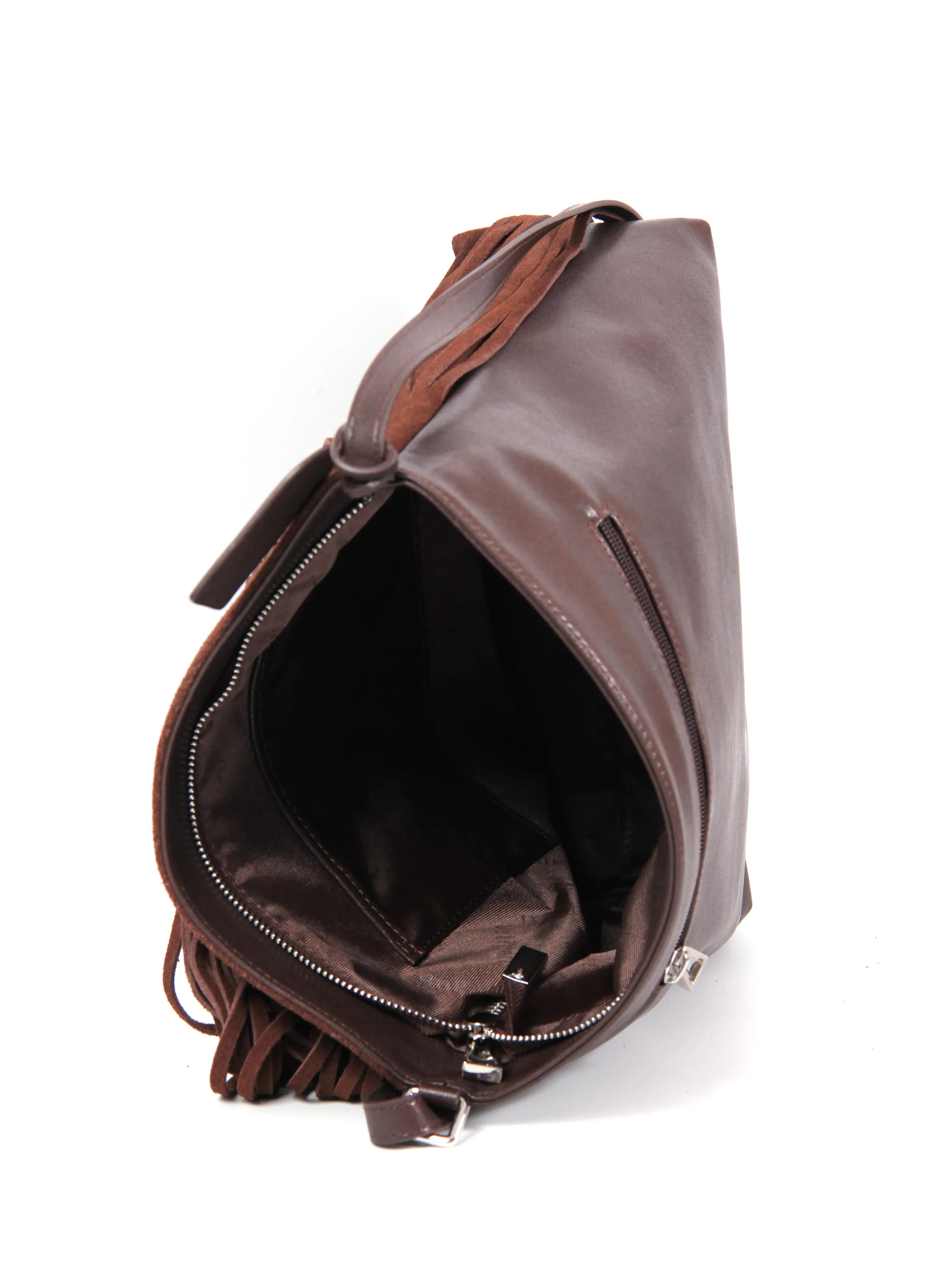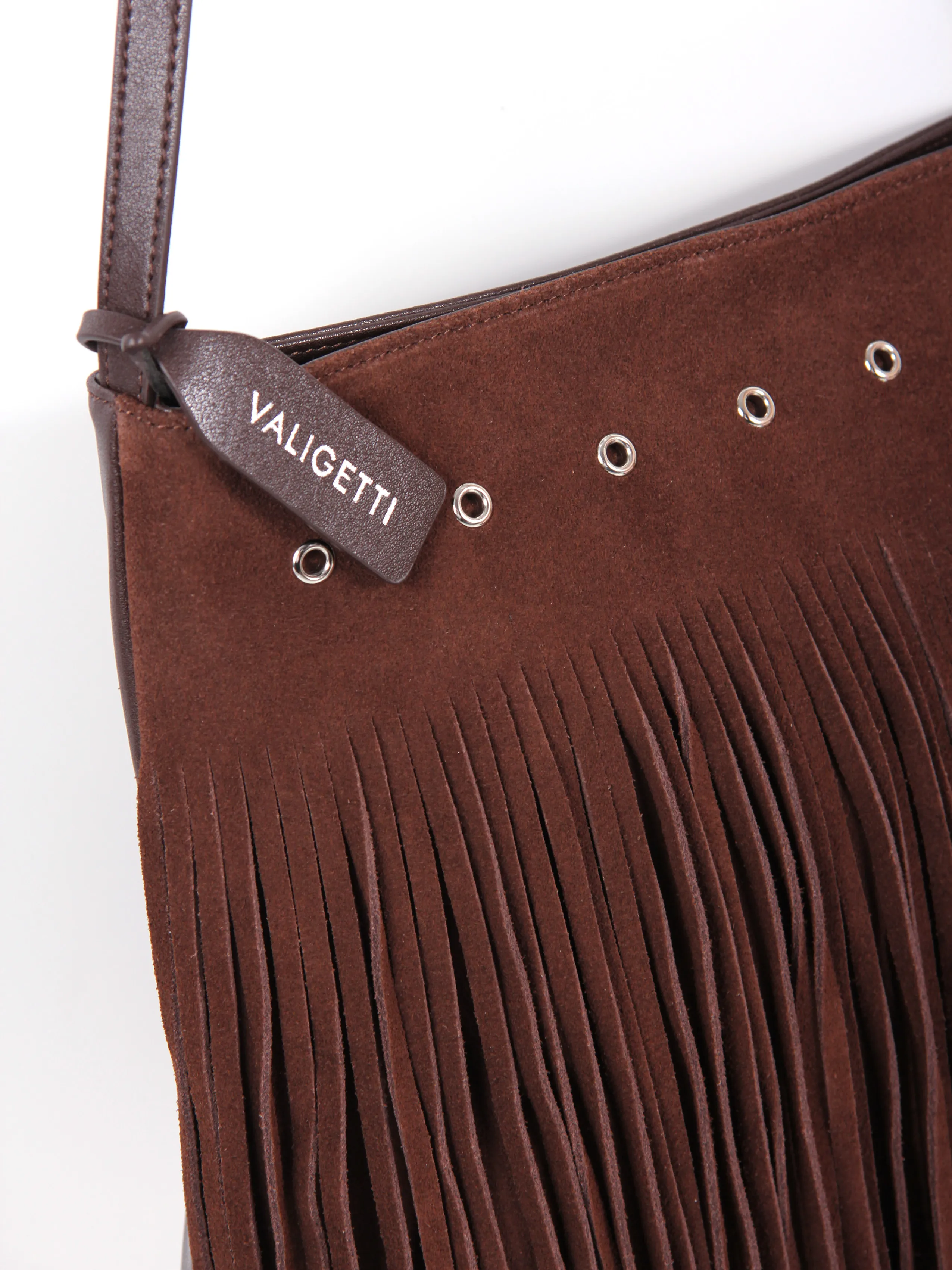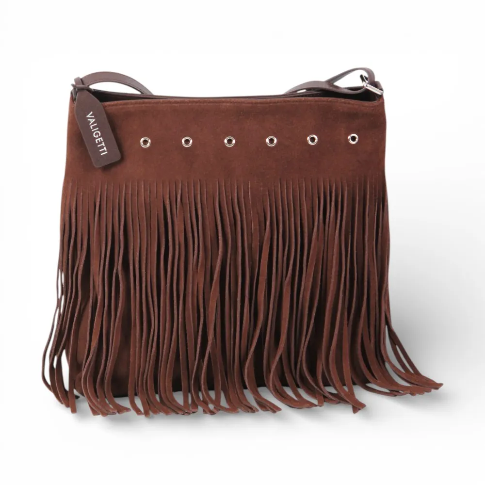 Сумка от бренда Valigetti выполнена из натуральной замши и кожи в коричневом цвете. Модель с несъемным регулируемым плечевым ремнем, часть лицевой стороны состоит из множества тонких замшевых полосок, которые свободно свисают, придавая изделию богемный, непринуждённый вид. Основное отделение на молнии, внутри: фирменная текстильная подкладка, накладной открытый карман и карман на молнии, на задней стороне сумки расположен карман быстрого доступа на молнии.