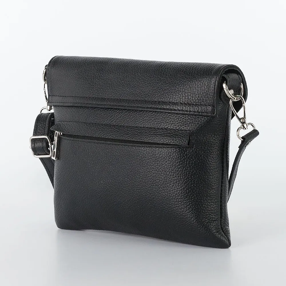 Сумка-клатч от торговой марки Poshete из натуральной кожи черного цвета. Плоская модель со съемным регулируемым плечевым ремнем. Закрывается треугольным клапаном на магнитной кнопке. Отделение на молнии. Внутри: фирменная подкладка, карман на молнии, накладной карман. На задней стороне – карман на скрытой молнии.