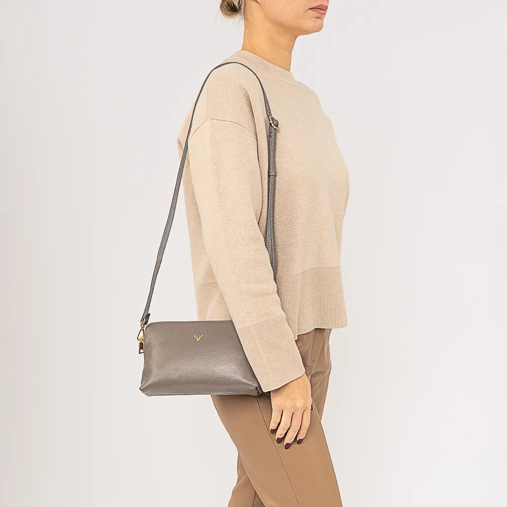 Сумка от торговой марки Poshete из натуральной кожи коричневого цвета. Лицевая сторона с оригинальным декором. Компактная модель со съемным регулируемым плечевым ремнем и ремешком для запястья. Отделение на молнии. Внутри: фирменная подкладка, карман на молнии, накладной карман. На задней стороне – карман на молнии.