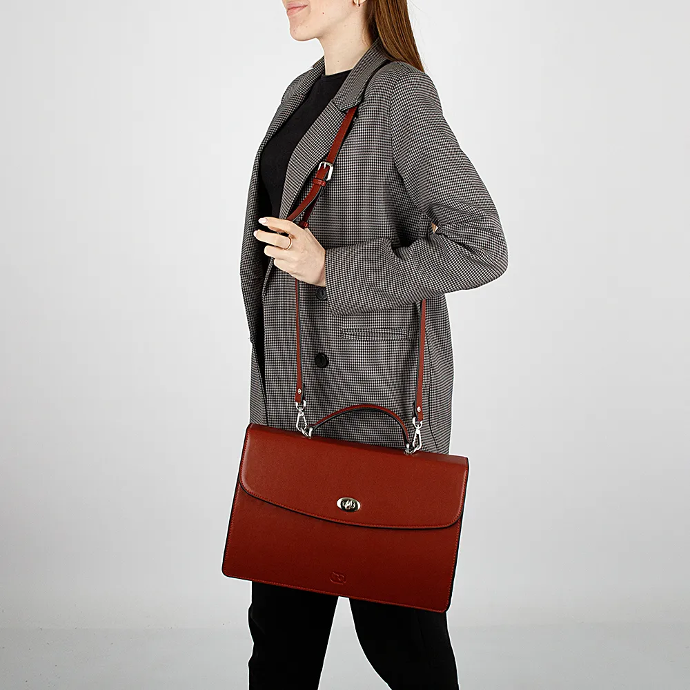 Женский портфель от торговой марки Francesco Molinary из натуральной кожи синего цвета. Жесткая элегантная модель с одной плотной ручкой и съемным плечевым ремнем. Закрывается клапаном на поворотном замке. Отделение с фирменной подкладкой. Внутри: плотная перегородка, органайзер для канцелярских принадлежностей, перегородка с карманом на молнии, образующая накладной карман. На задней стороне – накладной карман без застежки.