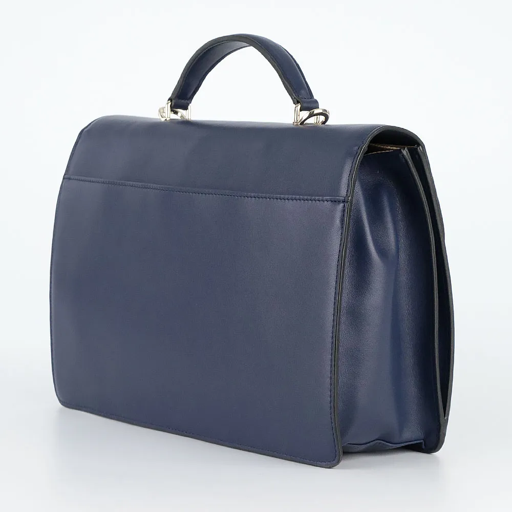 Женский портфель от торговой марки Francesco Molinary из натуральной кожи синего цвета. Жесткая элегантная модель с одной плотной ручкой и съемным плечевым ремнем. Закрывается клапаном на поворотном замке. Отделение с фирменной подкладкой. Внутри: плотная перегородка, органайзер для канцелярских принадлежностей, перегородка с карманом на молнии, образующая накладной карман. На задней стороне – накладной карман без застежки.