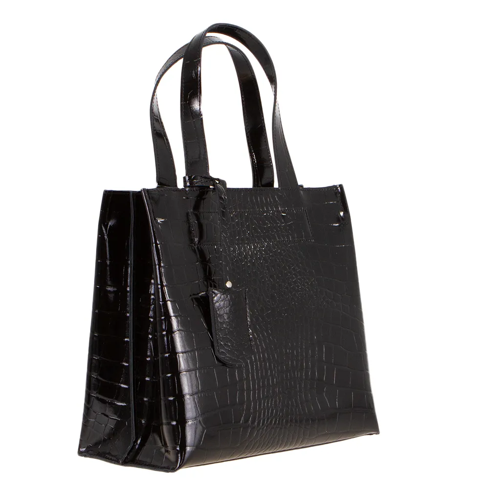 Стильная сумка от торговой марки Galanteya выполнена из натуральной кожи черного цвета с тиснением под крокодиловую кожу. Жесткая модель с двумя удлиненными ручками длиной около 43 см. Отделение на молнии. Внутри: частично на подкладке, жесткий средник на молнии, открытые карманы. На задней стороне – карман на молнии.