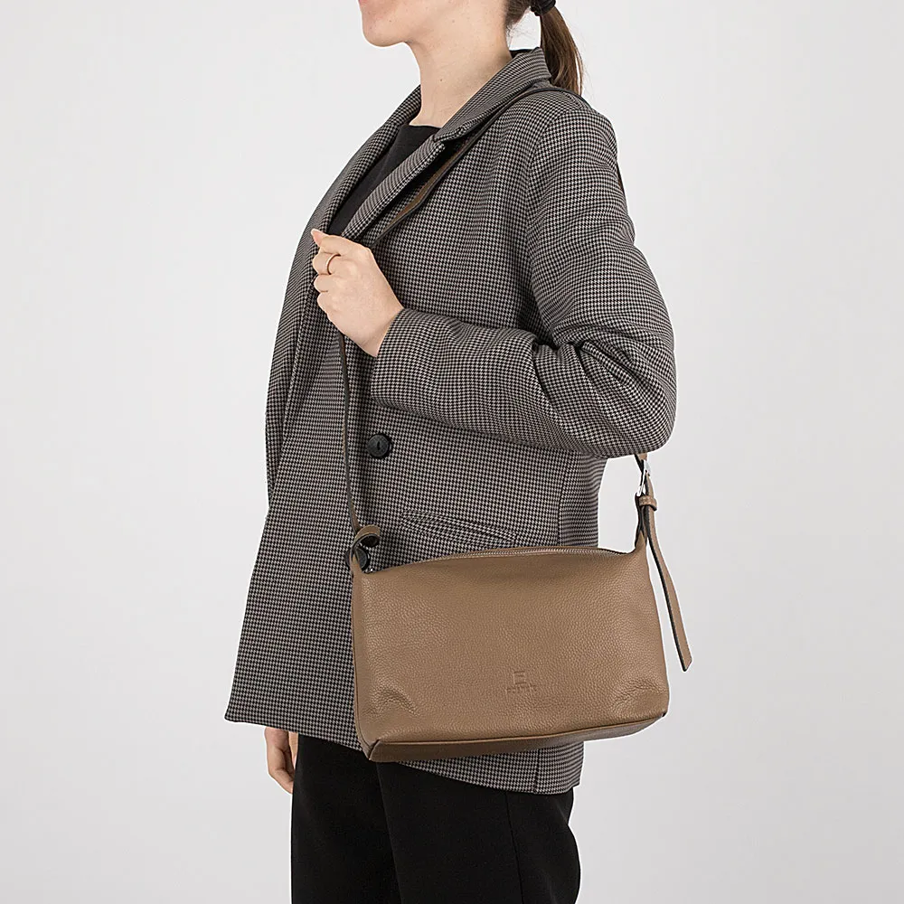 Сумка от торговой марки Poshete из натуральной кожи кофейного цвета. Модель с несъемным плечевым ремнем, регулируемым с одной стороны с помощью пряжки. Отделение на молнии. Внутри: фирменная подкладка, средник и карман на молнии, накладной карман. На задней стороне – карман на молнии.