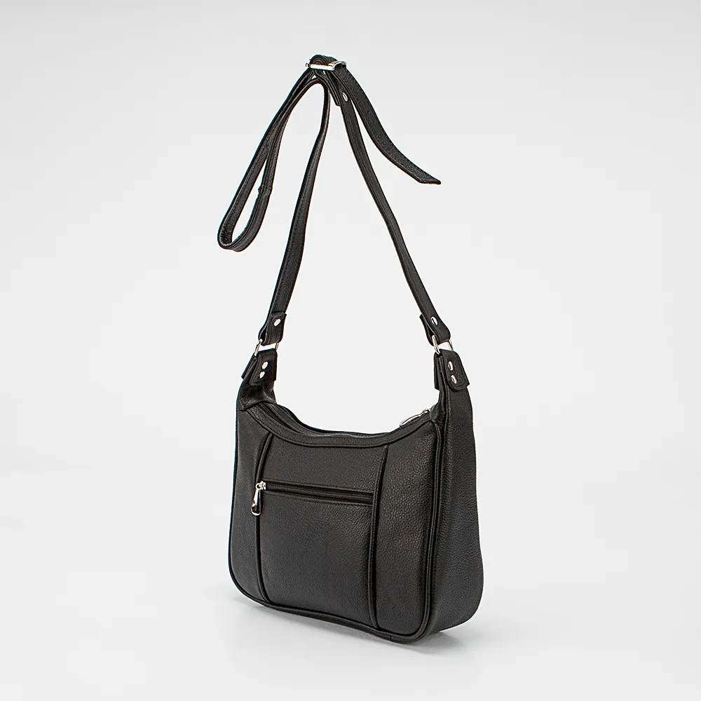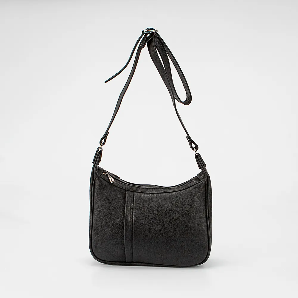 Сумка от торговой марки Francesco Molinary из натуральной кожи черного цвета. Модель с несъемным регулируемым плечевым ремнем. Два отделения на молнии, с текстильной подкладкой. В одном из них – карман на молнии, в другом – накладной карман. На задней стороне – карман на молнии.