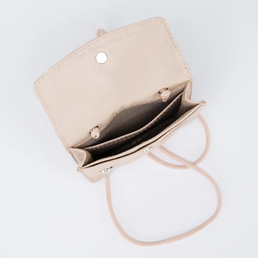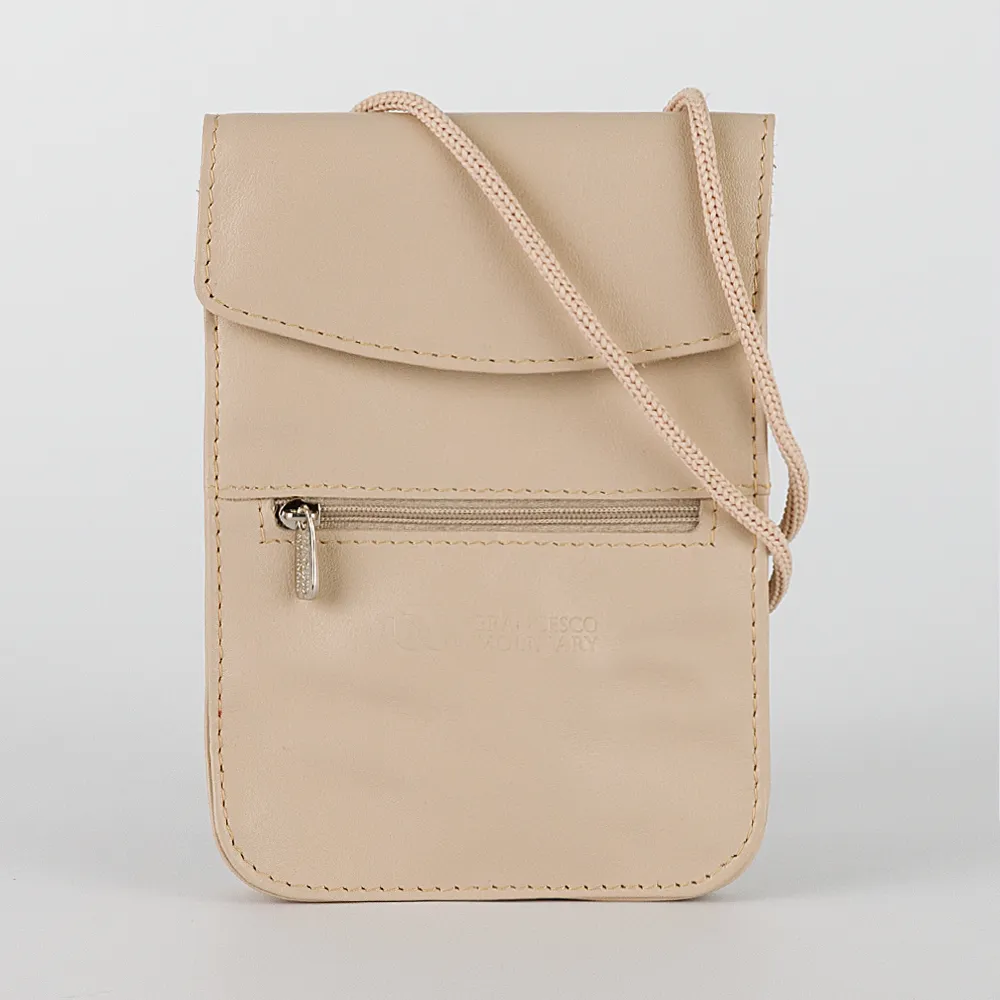 Сумка-визитка от торговой марки Francesco Molinary из натуральной мягкой кожи бежевого цвета. Компактная модель с несъемным нерегули руемым ремешком-веревкой со стоппером. Клапан на магнитной кнопке закрывает карман для карт без застежки и отделение, внутри которого: частичная подкладка, глубокий накладной карман. На лицевой стороне – карман на молнии. На задней стороне – вертикальный карман на молнии, шлевка для ношения сумки на ремне.