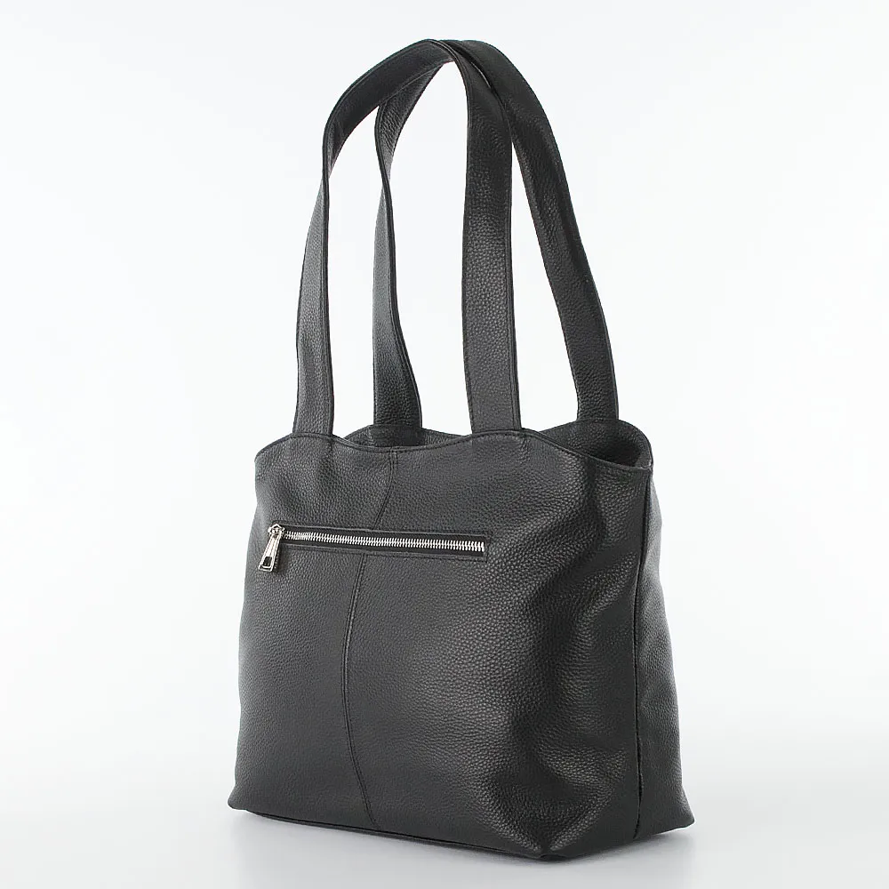 Сумка от торговой марки Poshete выполнена из натуральной кожи темно-серого цвета. Модель с двумя удлиненными ручками. Отделение на молнии с фирменной подкладкой и карманами.