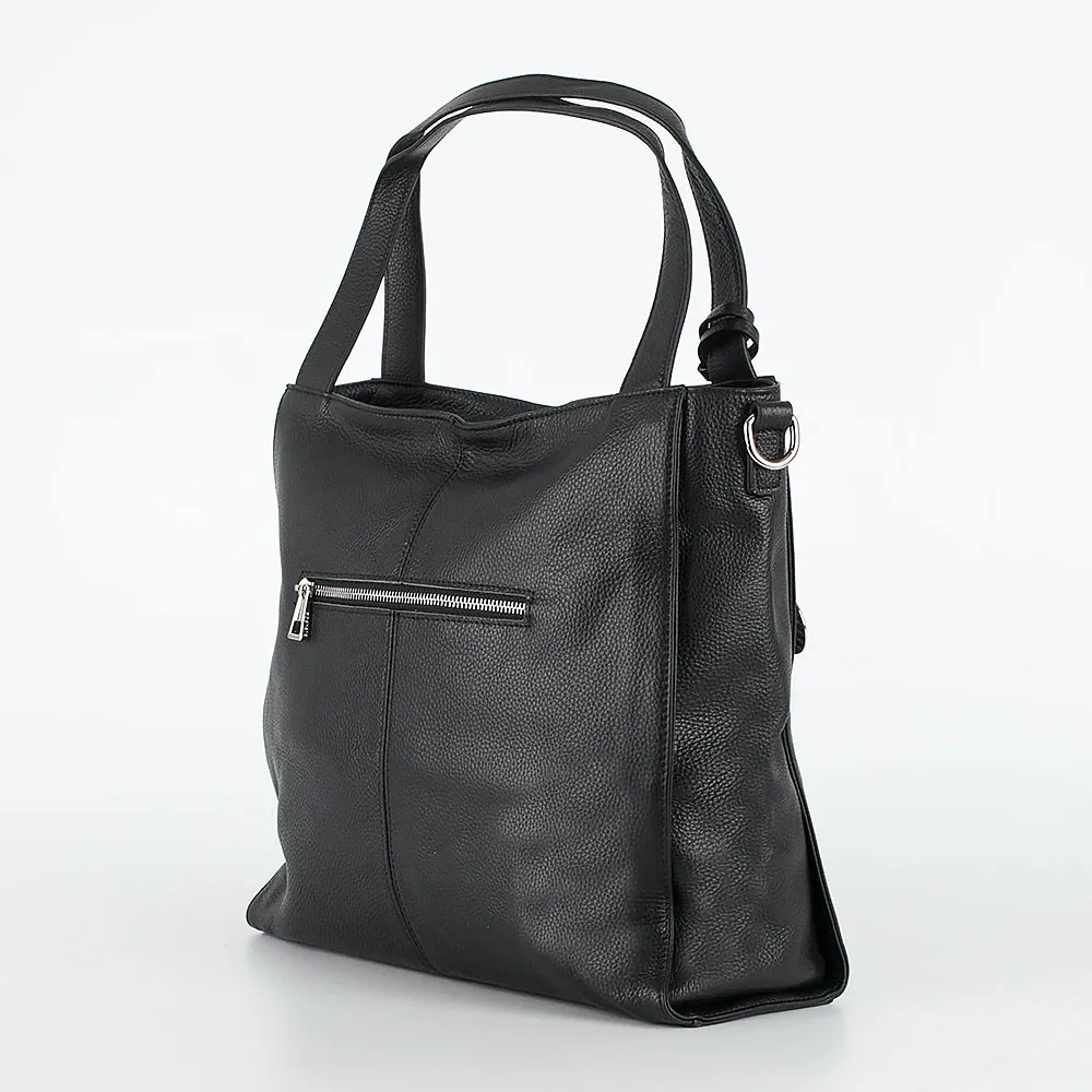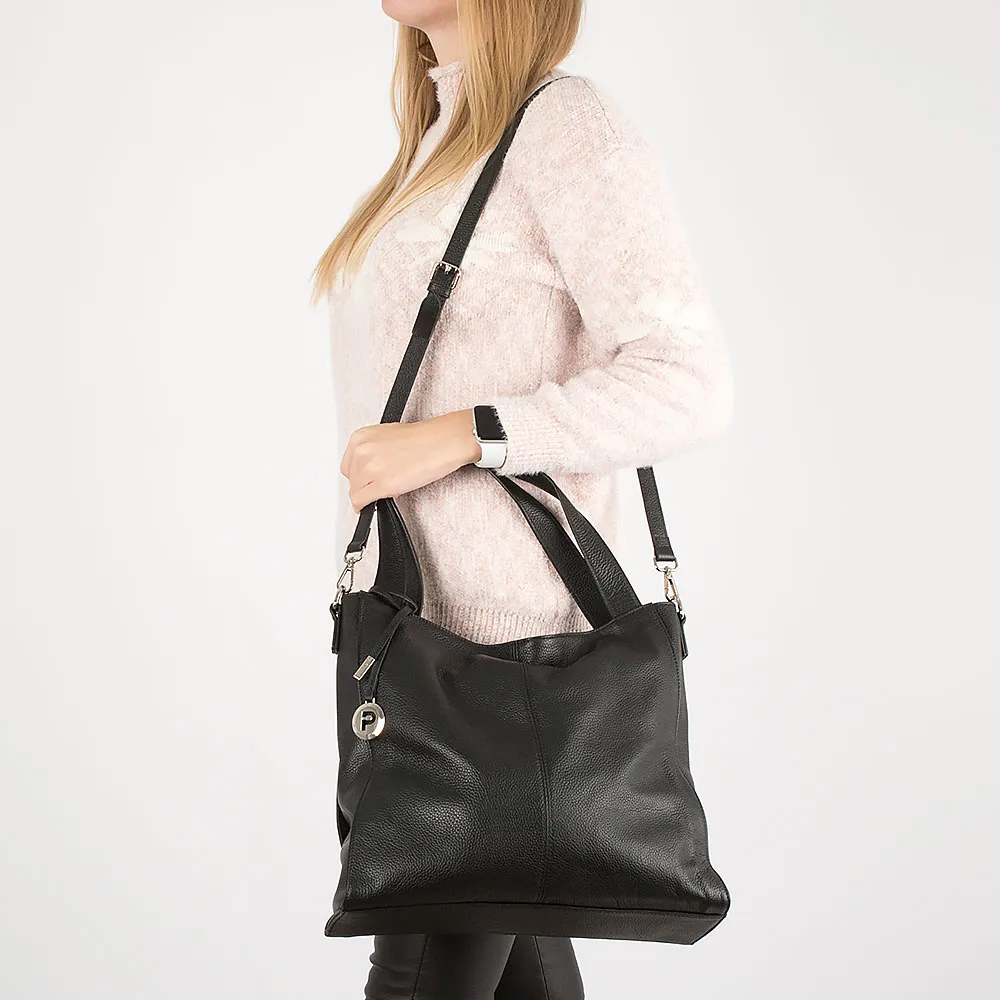 Сумка от торговой марки Poshete из натуральной кожи черного цвета. Модель с двумя удлиненными ручками с декоративной подвеской и съемным регулируемым плечевым ремнем. Отделение на молнии. Внутри: фирменная подкладка, средник и карман на молнии, два накладных кармана. На задней стороне – карман на молнии.
