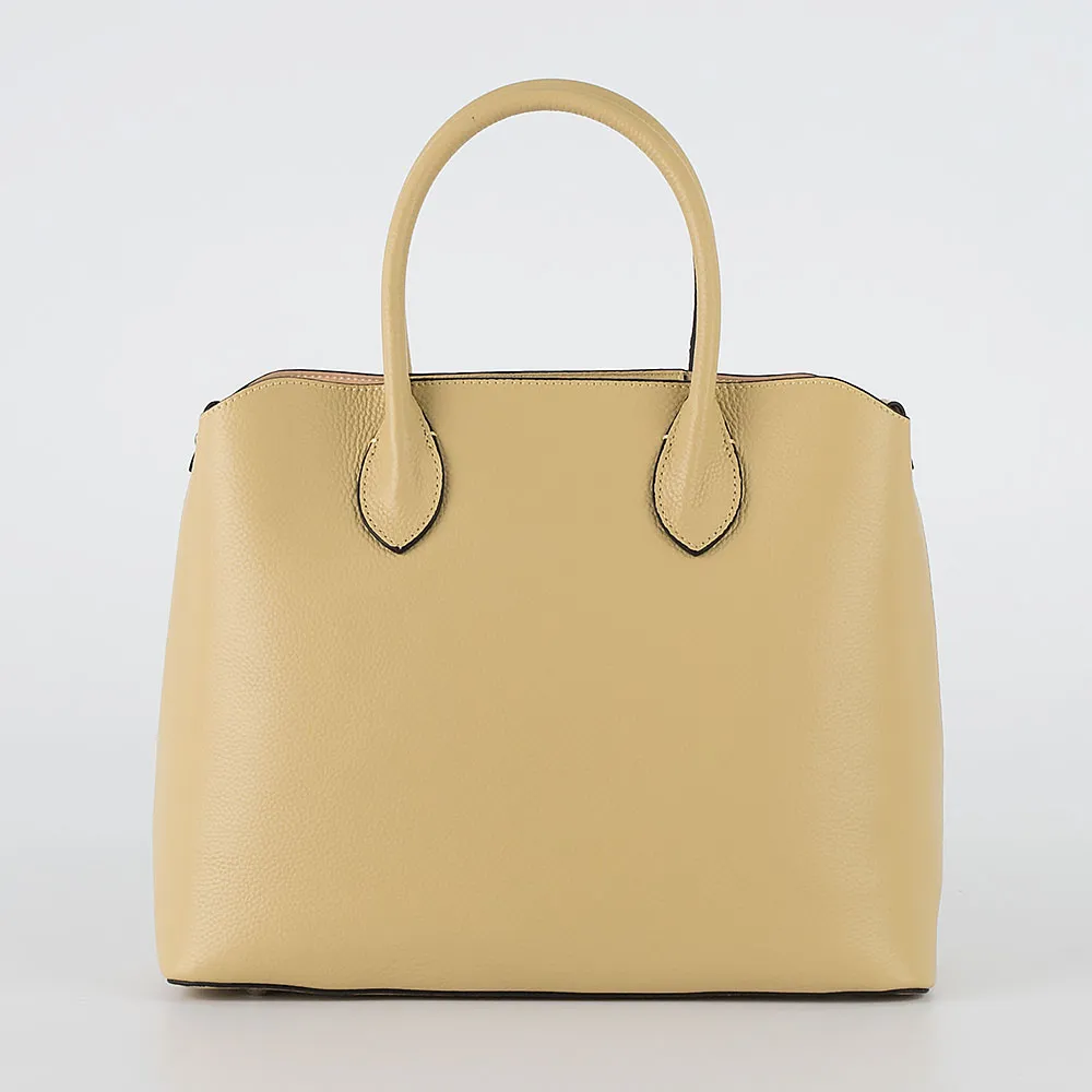 Сумка от торговой марки Poshete из натуральной кожи бледно-желтого цвета. Модель с двумя ручками и съемным регулируемым плечевым ремнем. Отделение с частичной подкладкой. По краям фиксируется магнитной кнопкой. Средник формирует отделение на молнии. Снаружи на нем – карман на молнии. Внутри: карман на молнии, два накладных кармана. Дно оснащено ножками для защиты от износа.