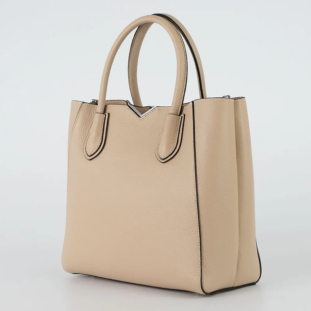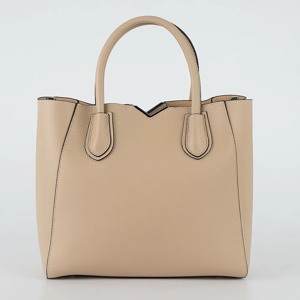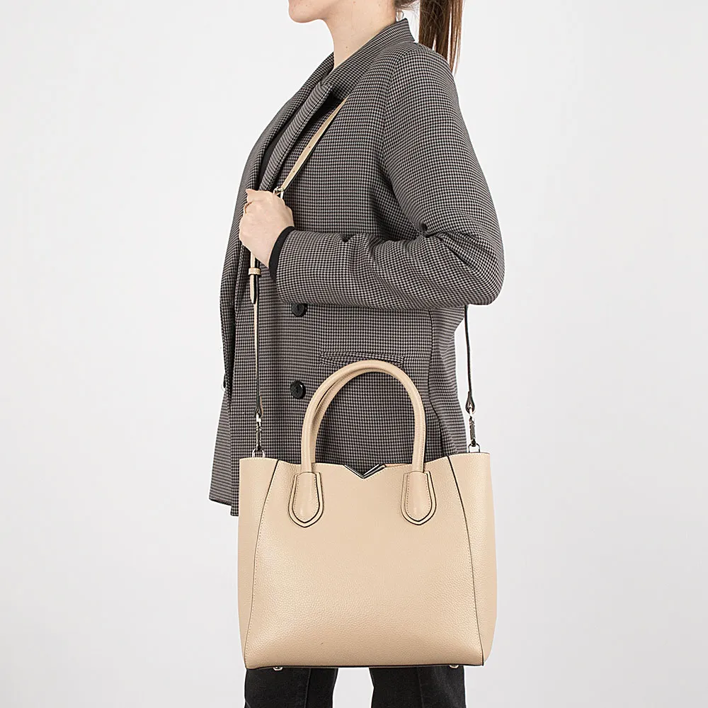 Сумка от торговой марки Poshete из натуральной зернистой кожи бежевого цвета. Модель с двумя ручками и съемным регулируемым плечевым ремнем. Внутри: с частичной подкладкой, по краям фиксируется магнитными кнопками. Средник формирует основное отделение на молнии; снаружи на нем – карман на молнии; внутри: карман на молнии, два накладных кармана. Дно оснащено металлическими ножками для защиты от износа.