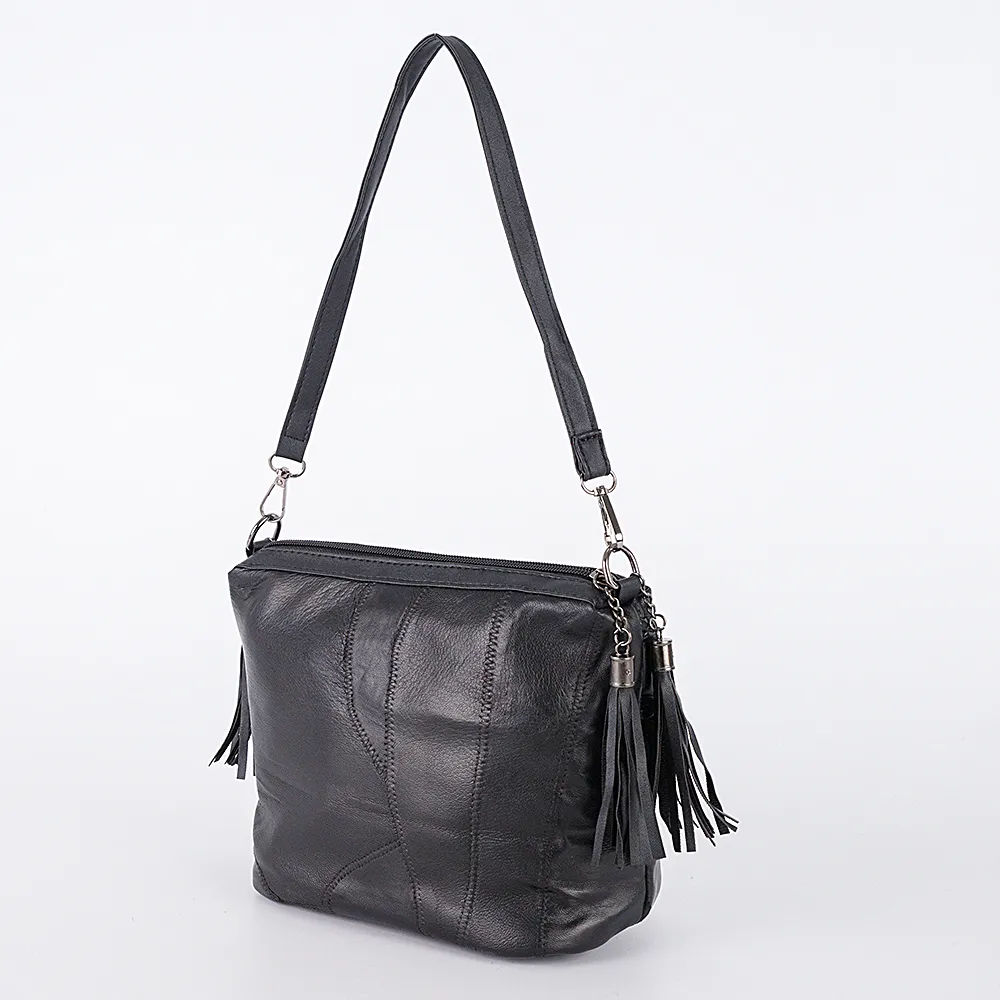Сумка от торговой марки Passo Avanti выполнена в сочетании искусственной и мягкой натуральной кожи черного цвета. Компактная модель со съемной удлиненной ручкой и съемным регулируемым плечевым ремнем. Отделение на молнии, с текстильной подкладкой и карманами. По бокам декорирована подвесками-кисточками на цепочке. Фигурные кусочки кожи обработаны строчкой «зигзаг»; декорирована кожаными косичками, расположенными «елочкой», и подвесками-кисточками.