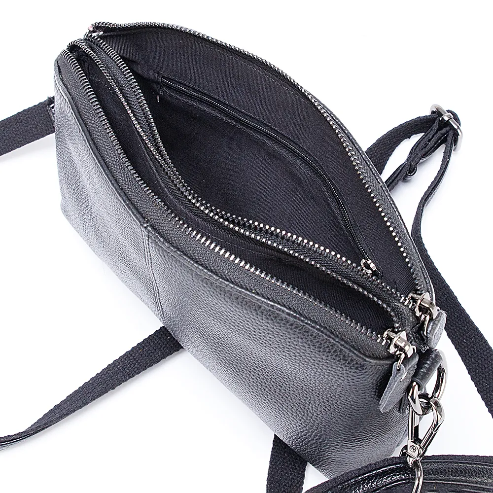 Cумка кросс-боди от торговой марки Poshete выполнена из натуральной крупнозернистой кожи черного цвета. Модель в форме купола, со съемным регулируемым плечевым ремнем, с серебристой фурнитурой. Два отделения на молнии с кожаными пуллерами. Внутри: фирменная подкладка; в одном из них – карман на молнии, в другом – накладной карман. На задней стороне – карман на молнии.