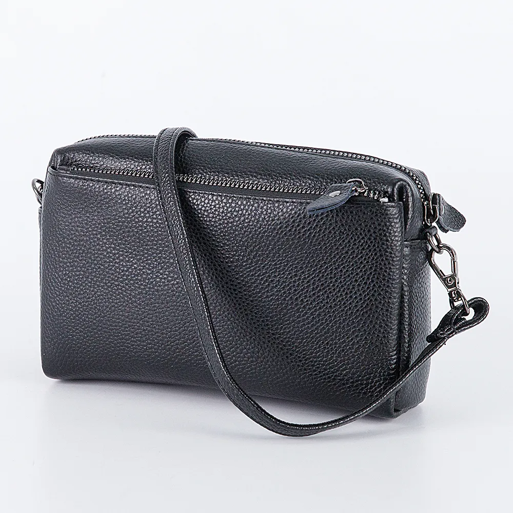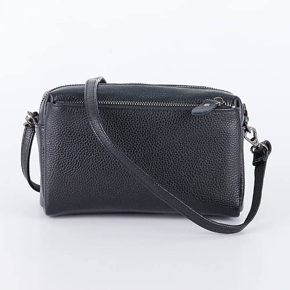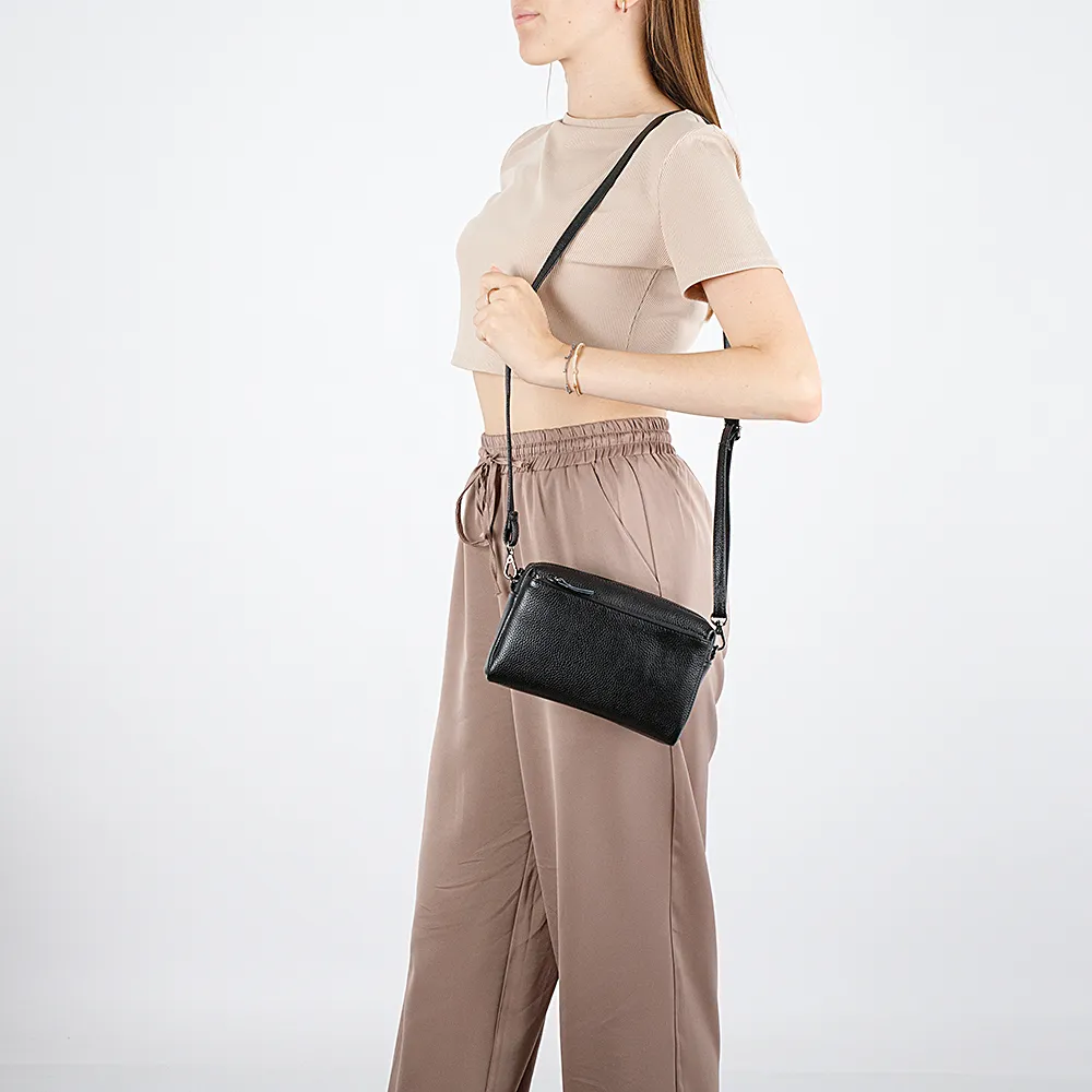 Сумка кросс-боди от торговой марки Poshete из натуральной зернистой кожи черного цвета. Компактная модель со съемным регулируемым плечевым ремнем. Отделение на молнии. Внутри: карман на молнии, накладной карман. На лицевой и задней сторонах – карман на молнии.