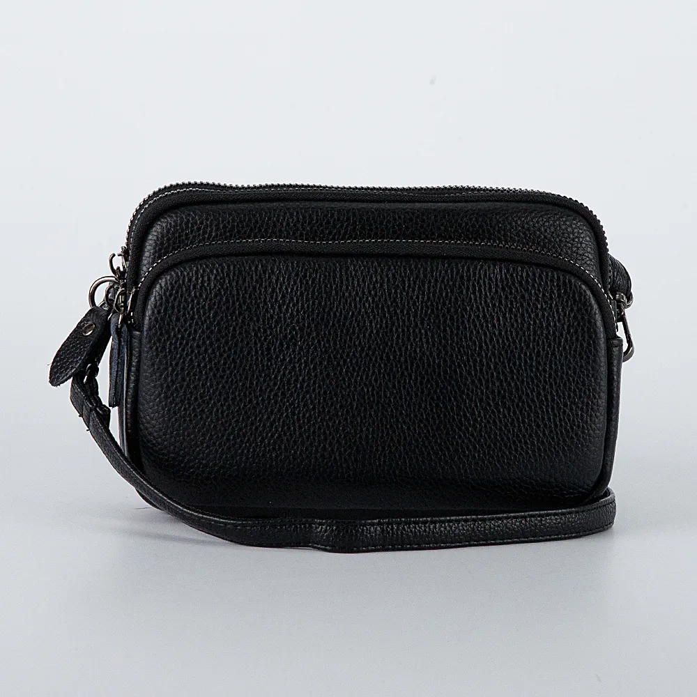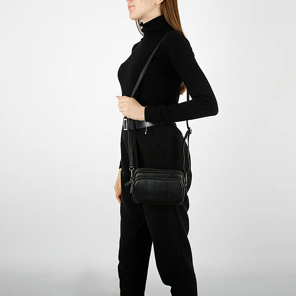 Сумка кросс-боди от торговой марки Poshete из натуральной зернистой кожи черного цвета. Модель со съемным регулируемым плечевым ремнем. Два отделения на молнии с фирменной подкладкой. В одном из них – карман на молнии, в другом – накладной карман. На лицевой стороне – накладной карман на молнии. На задней – прорезной карман на молнии.
