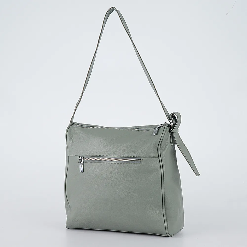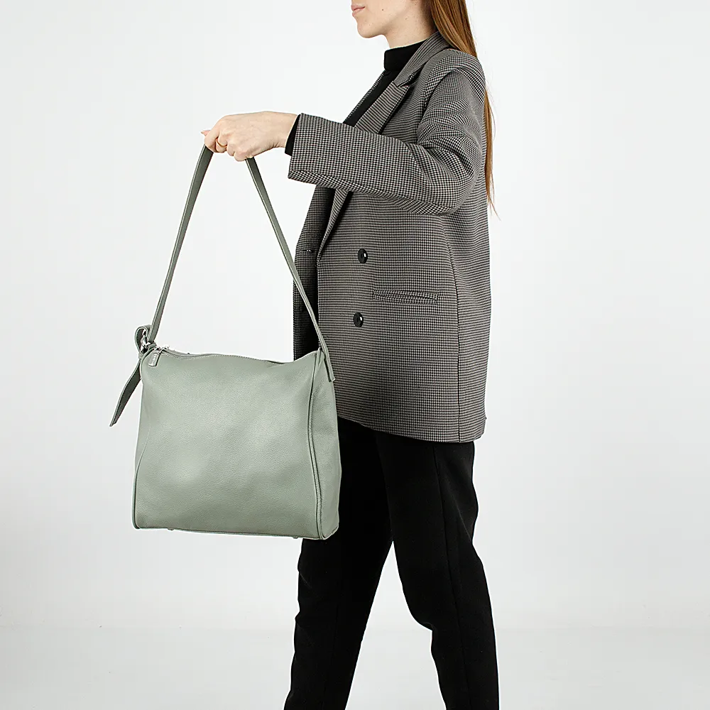 Сумка от торговой марки Poshete из натуральной кожи светло-зеленого цвета. Вместительная модель квадратной формы с несъемным регулируемым ручкой-ремнем. Два отделения на молнии, с текстильной подкладкой. В одном из них – карман на молнии, в другом – накладной карман. На задней стороне – карман на молнии. Дно оснащено металлическими ножками от износа.