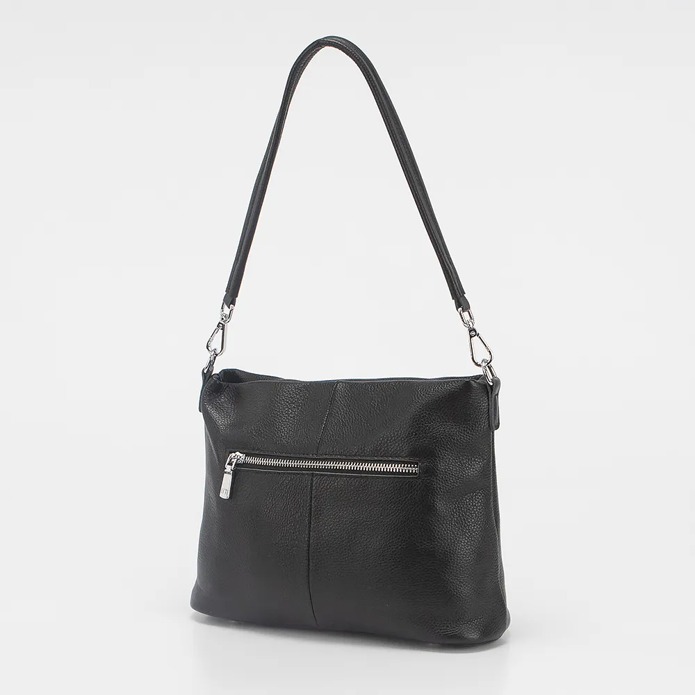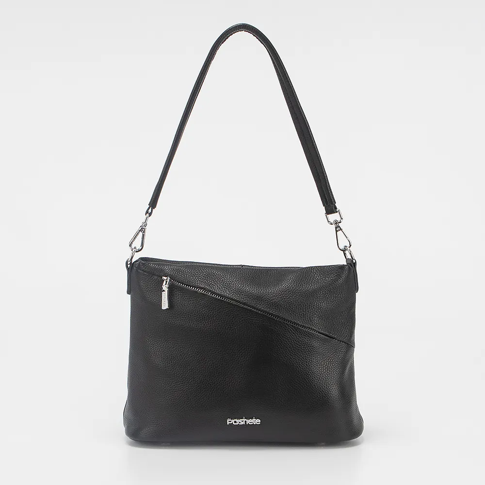 Сумка от торговой марки Poshete из натуральной кожи черного цвета. Модель со съемной ручкой и съемным регулируемым плечевым ремнем. Внутри: фирменная подкладка, средник и карман на молнии, накладной карман. На лицевой стороне – небольшой карман на молнии, на задней стороне – карман на молнии. Дно оснащено ножками для защиты от износа.