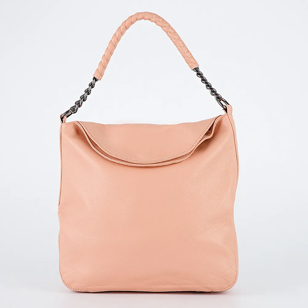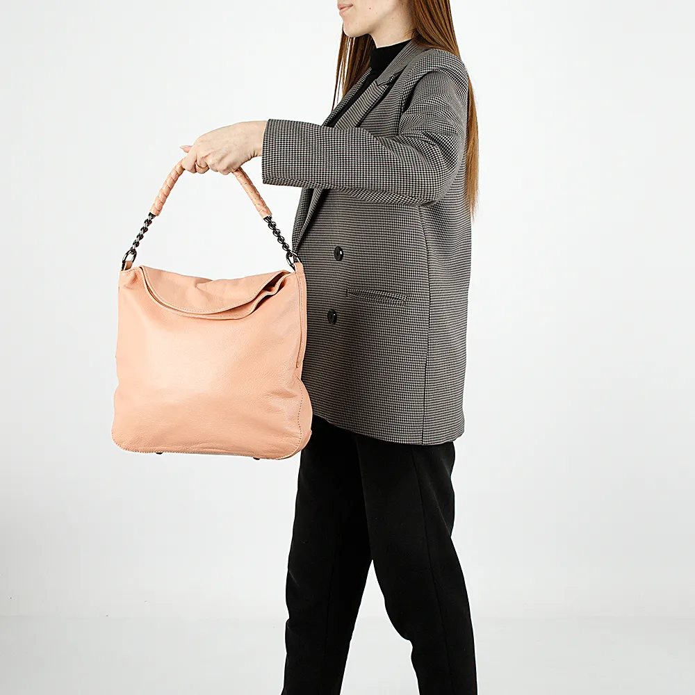 Сумка от торговой марки Poshete из натуральной кожи кораллово-розового цвета. Модель с ручкой-цепочкой. Верхняя часть фиксируется скрытым магнитом. Отделение на молнии. Внутри: текстильная подкладка, средник и карман на молнии, накладной карман. На задней стороне – карман на молнии. Дно оснащено ножками для защиты от износа.
