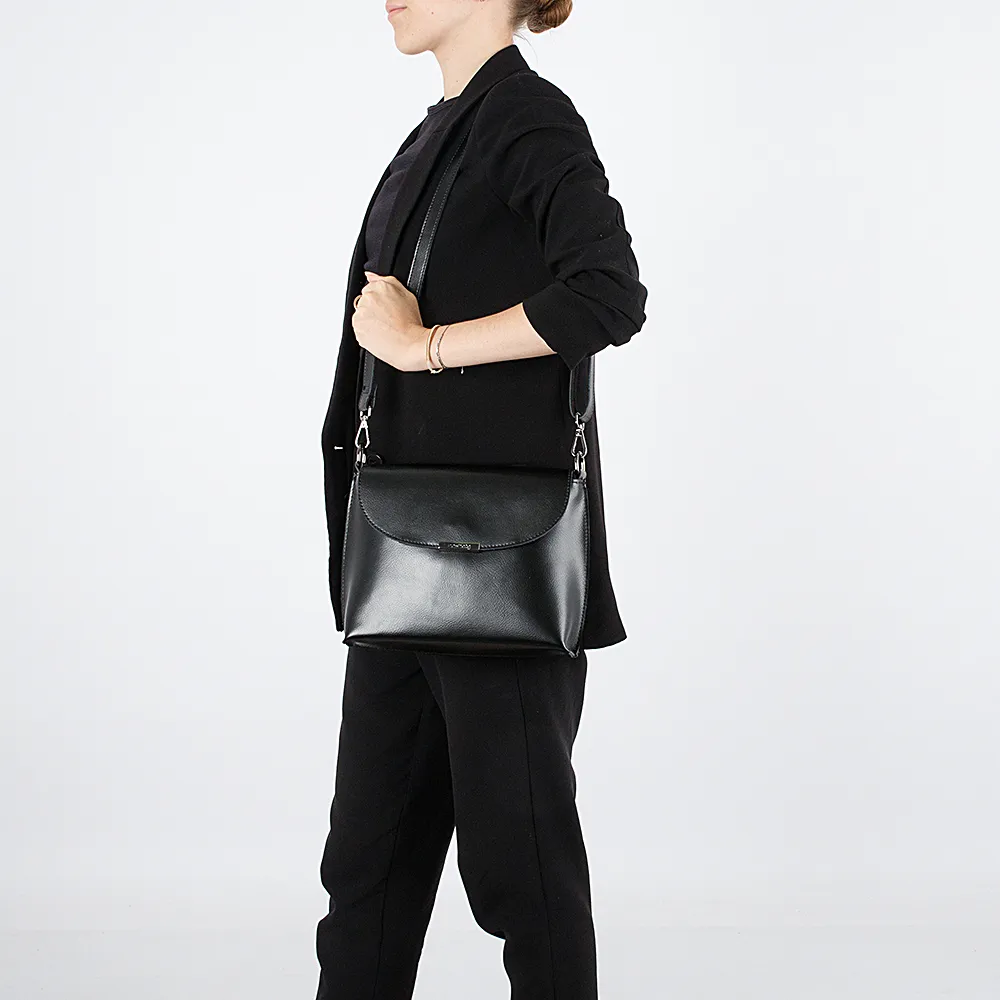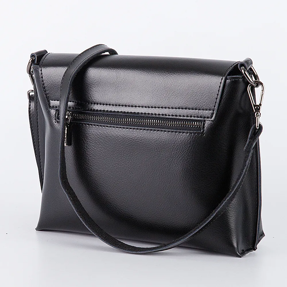 Сумка кросс-боди от торговой марки Poshete выполнена из гладкой натуральной кожи черного цвета. Жесткая модель со съемным регулируемым плечевым ремнем. Закрывается клапаном на магнитной кнопке. Отделение на молнии. Внутри: фирменная подкладка, средник и карман на молнии, накладной карман. На задней стороне – карман на молнии.