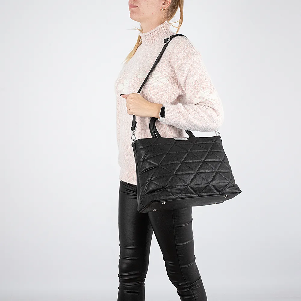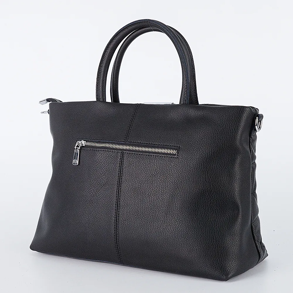 Сумка от торговой марки Poshete из натуральной кожи черного цвета с геометрической стежкой. Вместительная модель с двумя плотными ручками и съемным регулируемым плечевым ремнем. Отделение на молнии. Внутри: фирменная подкладка, средник и карман на молнии, накладной карман. На задней стороне – карман на молнии. Дно оснащено металлическими ножками для защиты от износа.