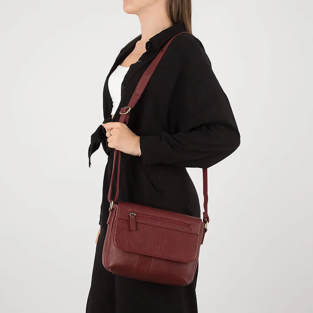 Стильная сумка от бренда Poshete выполнена из натуральной кожи, в бордовом цвете. Модель с несъемным регулируемым плечевым ремнем. Закрывается клапаном на магнитной кнопке. На клапане имеется прорезной карман на молнии, под клапаном – накладной карман на молнии и отделение на молнии. Внутри отделения: текстильная подкладка, карман на молнии и накладной карман. На задней стороне – карман на молнии.