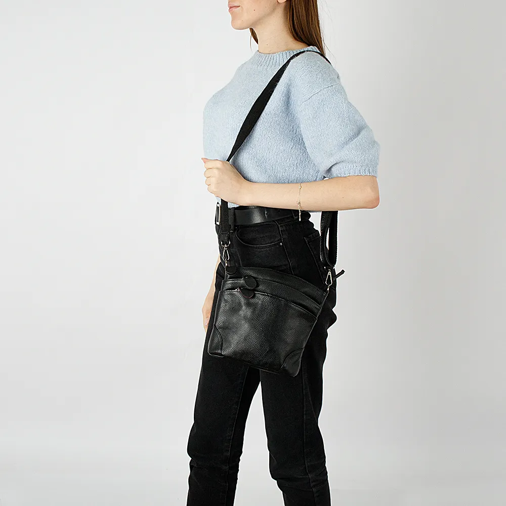 Сумка от торговой марки Poshete из натуральной кожи черного цвета. Модель со съемным регулируемым плечевым ремнем. Отделение на молнии. Внутри: текстильная подкладка, карман на молнии. На лицевой стороне – два кармана на молнии. На задней стороне – карман на молнии.