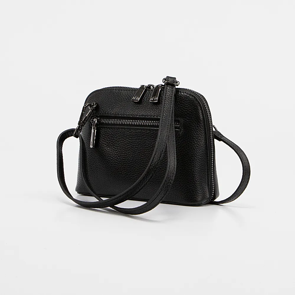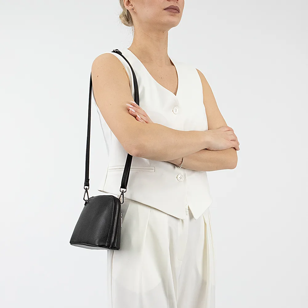 Миниатюрная сумочка от торговой марки Poshete из натуральной кожи черного цвета. Модель в форме купола со съемным регулируемым плечевым ремнем и съемным ремешком для запястья. Отделение на молнии. Внутри: фирменная подкладка, средник и карман на молнии, накладной карман. На задней стороне – карман на молнии.