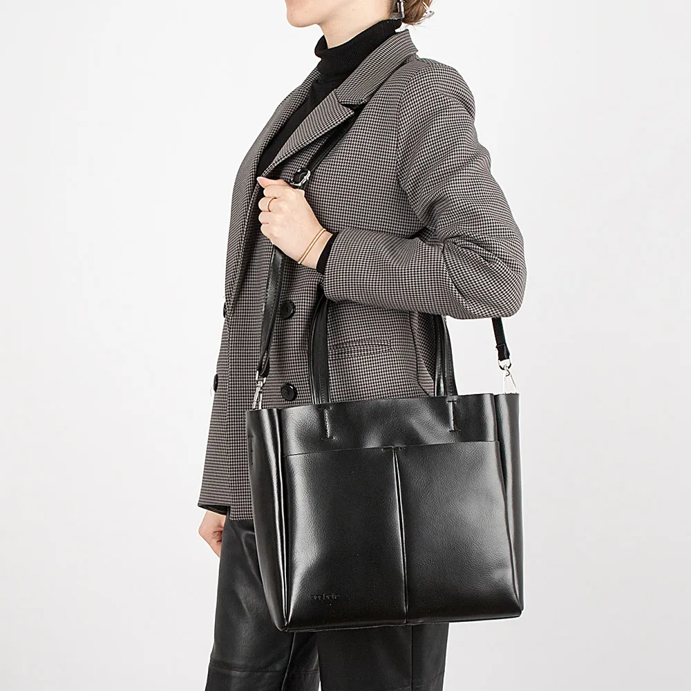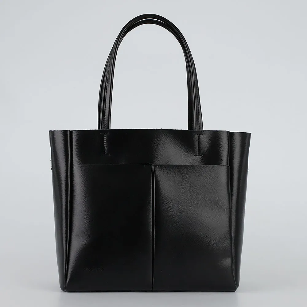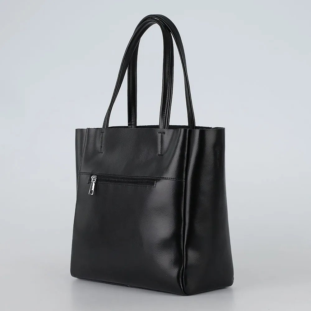 Сумка от торговой марки Poshete из натуральной кожи черного цвета. Модель с двумя ручками и съемным регулируемым плечевым ремнем. Отделение на молнии. Внутри: карман на молнии, два накладных кармана. Между краями сумки и отделением имеется место для мелких вещей или зонта. На лицевой стороне – два кармана без застежки. На задней стороне – карман на молнии.