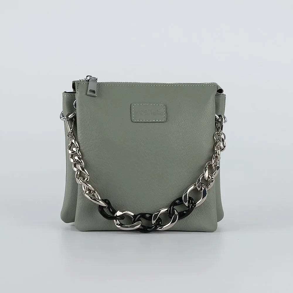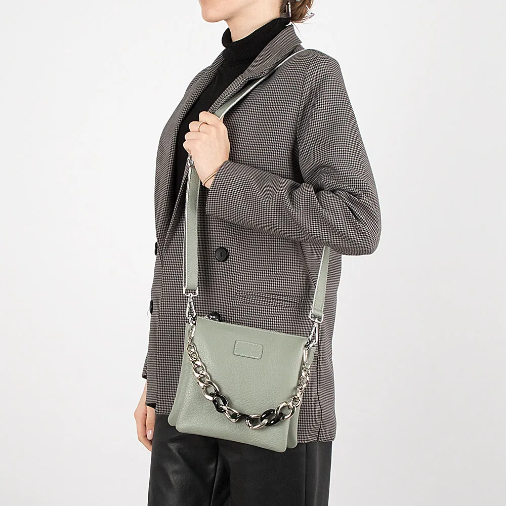 Сумка от торговой марки Poshete из натуральной кожи зеленого цвета. Компактная модель с ручкой-цепочкой с разно-размерными звеньями и съемным регулируемым плечевым ремнем. Закрывается молнией. Внутри: три отсека с текстильной подкладкой; в заднем – карман на молнии.