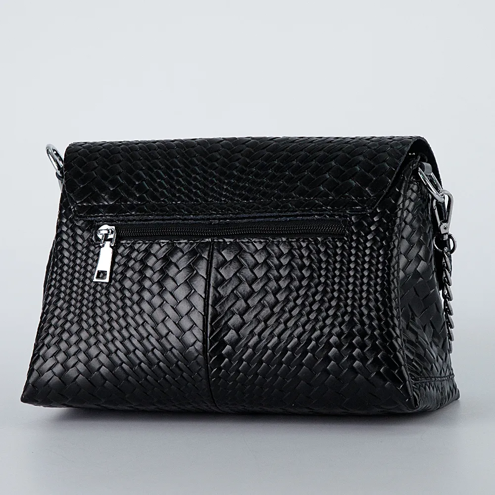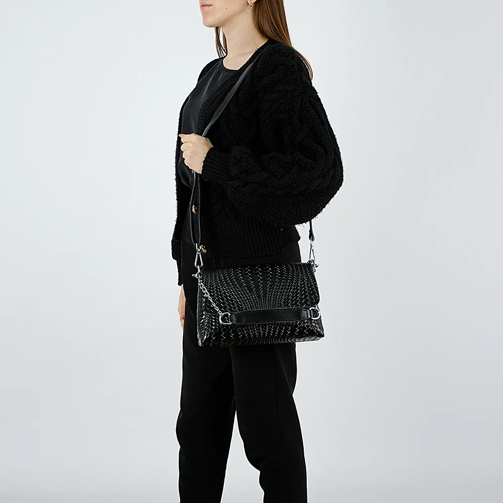 Стильная сумка от торговой марки Poshete выполнена из натуральной кожи черного цвета с тиснением под плетение. Модель с ручкой в виде ремешка с цепочкой и съемным плечевым ремнем; фурнитура серебряного цвета. Закрывается клапаном на магнитной кнопке. Молния закрывает три отделения, в среднем – карман на молнии и два накладных кармана. На задней стороне – карман на молнии.