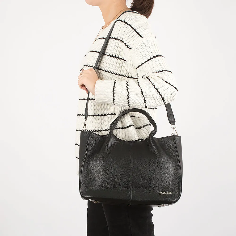 Сумка от торговой марки Poshete из натуральной кожи черного цвета. Вместительная модель с двумя короткими ручками и широким съемным регулируемым плечевым ремнем. Отделение на молнии. Внутри: текстильная подкладка, средник и карман на молнии, два накладных кармана. На задней стороне – карман на молнии. Дно оснащено металлическими ножками для защиты от износа.