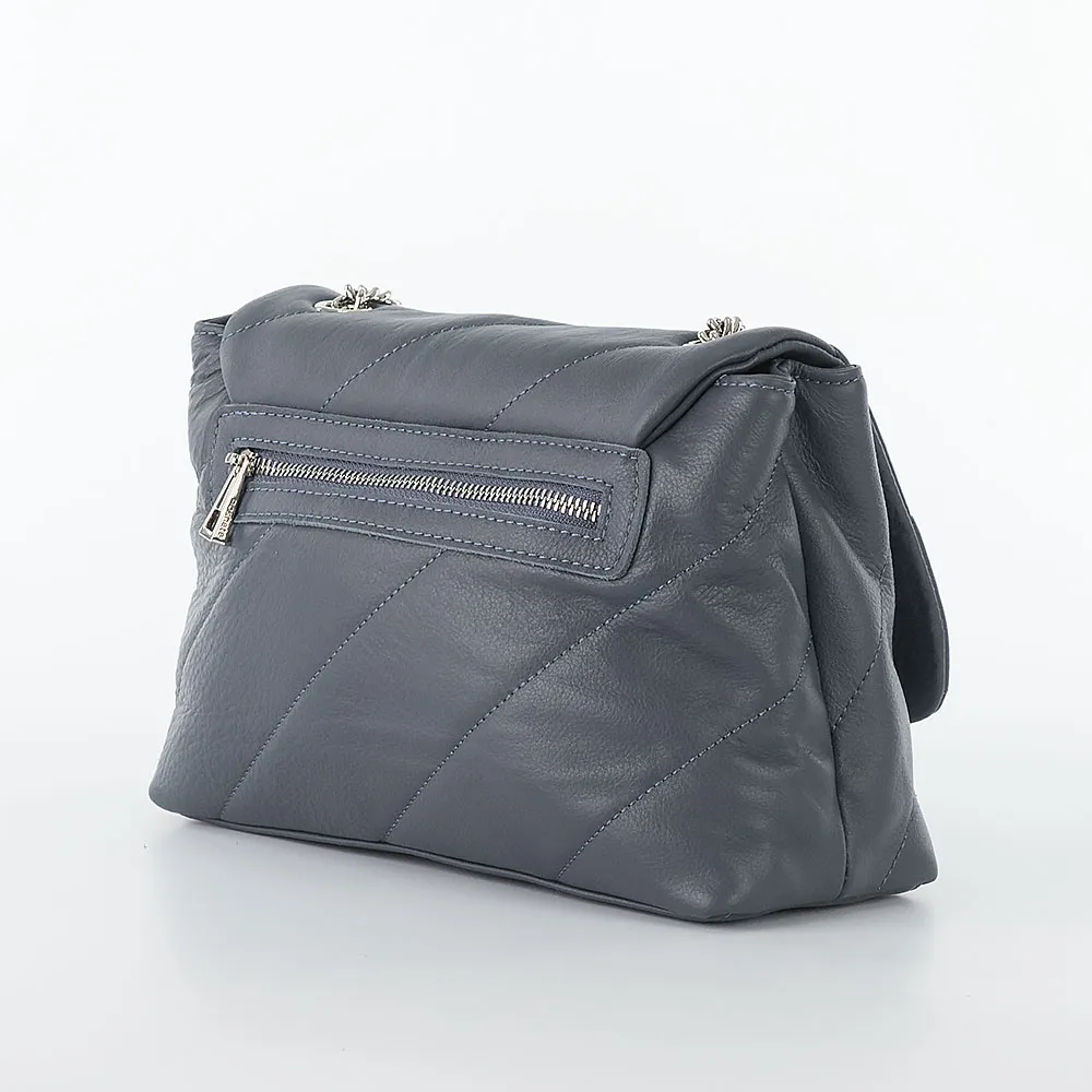 Сумка от торговой марки Poshete из натуральной кожи серого цвета. Декорирована диагональной стежкой. Модель с плечевым ремнем-цепочкой. Закрывается клапаном на поворотном замке. Отделение на молнии. Внутри: фирменная подкладка, средник и карман на молнии, накладной карман. На задней стороне – карман на молнии.