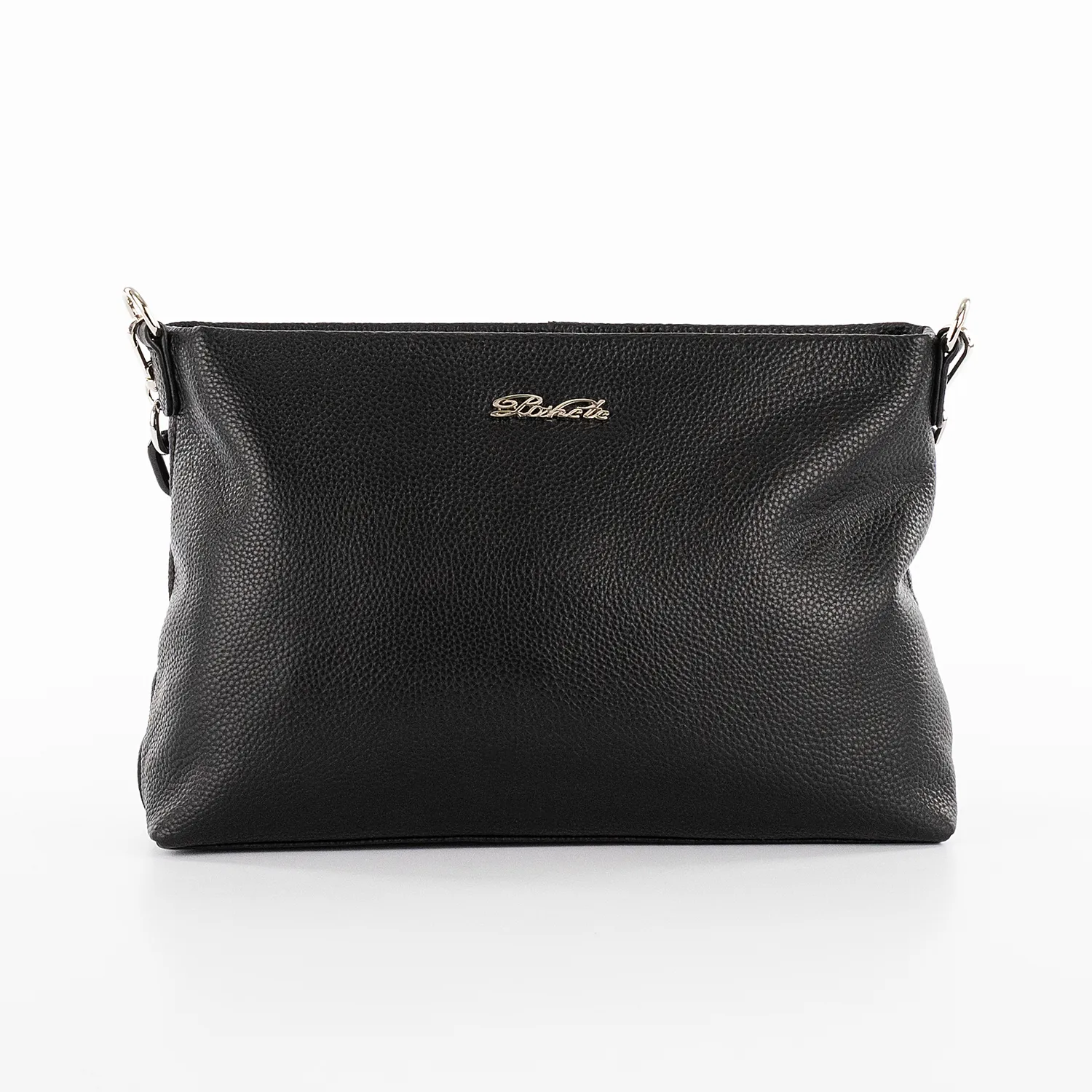 Сумка от торговой марки Poshete из натуральной кожи черного цвета. Модель с удлиненной съемной ручкой-цепочкой и съемным регулируемым плечевым ремнем. Отделение на молнии. Внутри: фирменная подкладка, средник и карман на молнии, два накладных кармана. На задней стороне – карман на молнии.