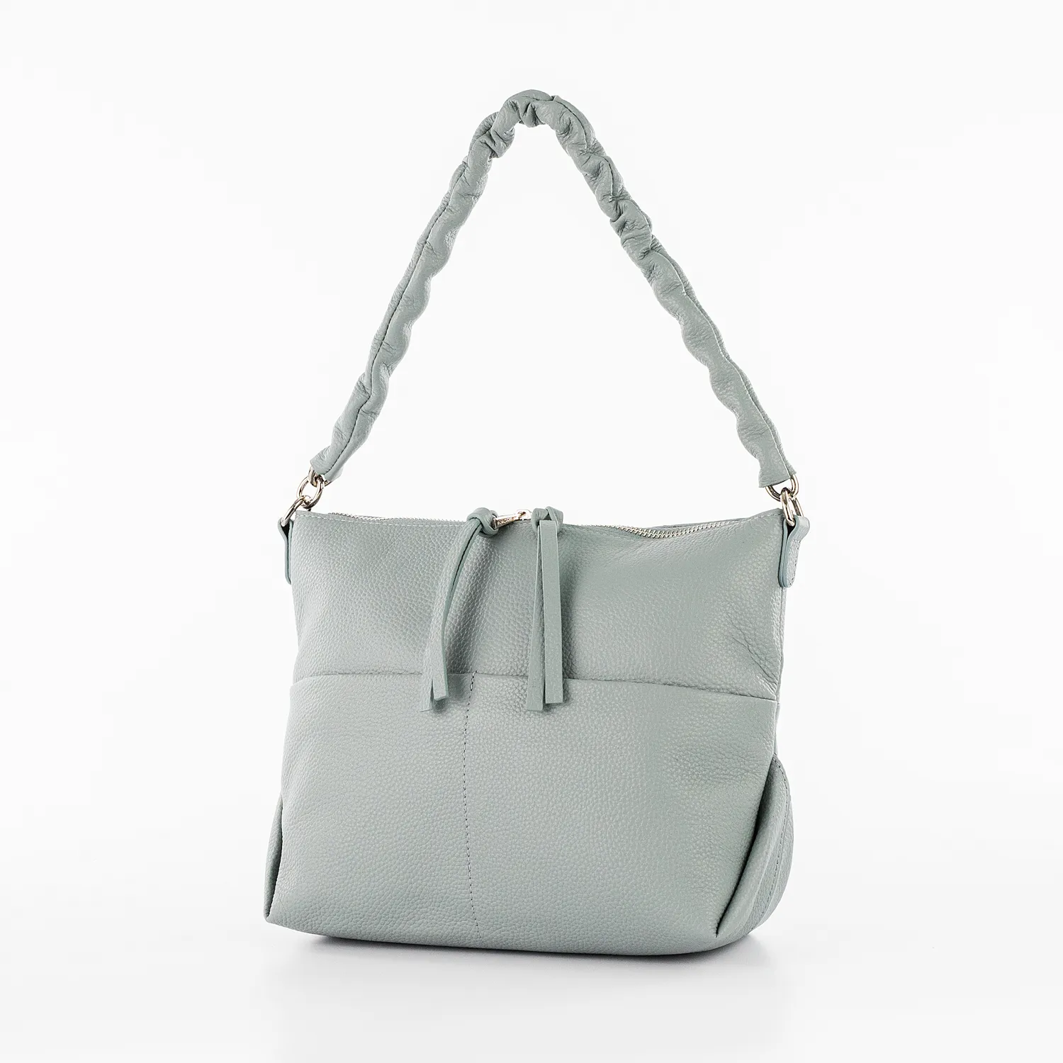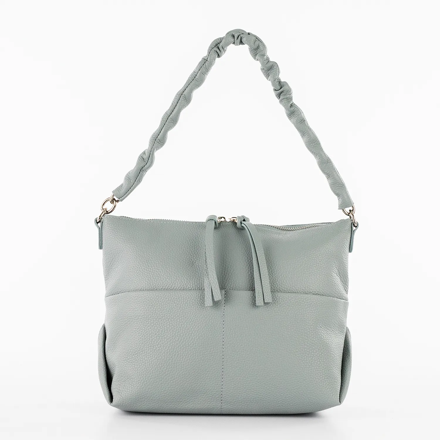 Сумка от торговой марки Poshete из натуральной кожи бледно-голубого цвета. Модель с удлиненной ручкой-цепочкой, обтянутой кожей, и съемным регулируемым плечевым ремнем. Отделение на молнии. Внутри: фирменная подкладка, средник и карман на молнии, два накладных кармана. На лицевой и задней сторонах – по два накладных кармана без застежки.