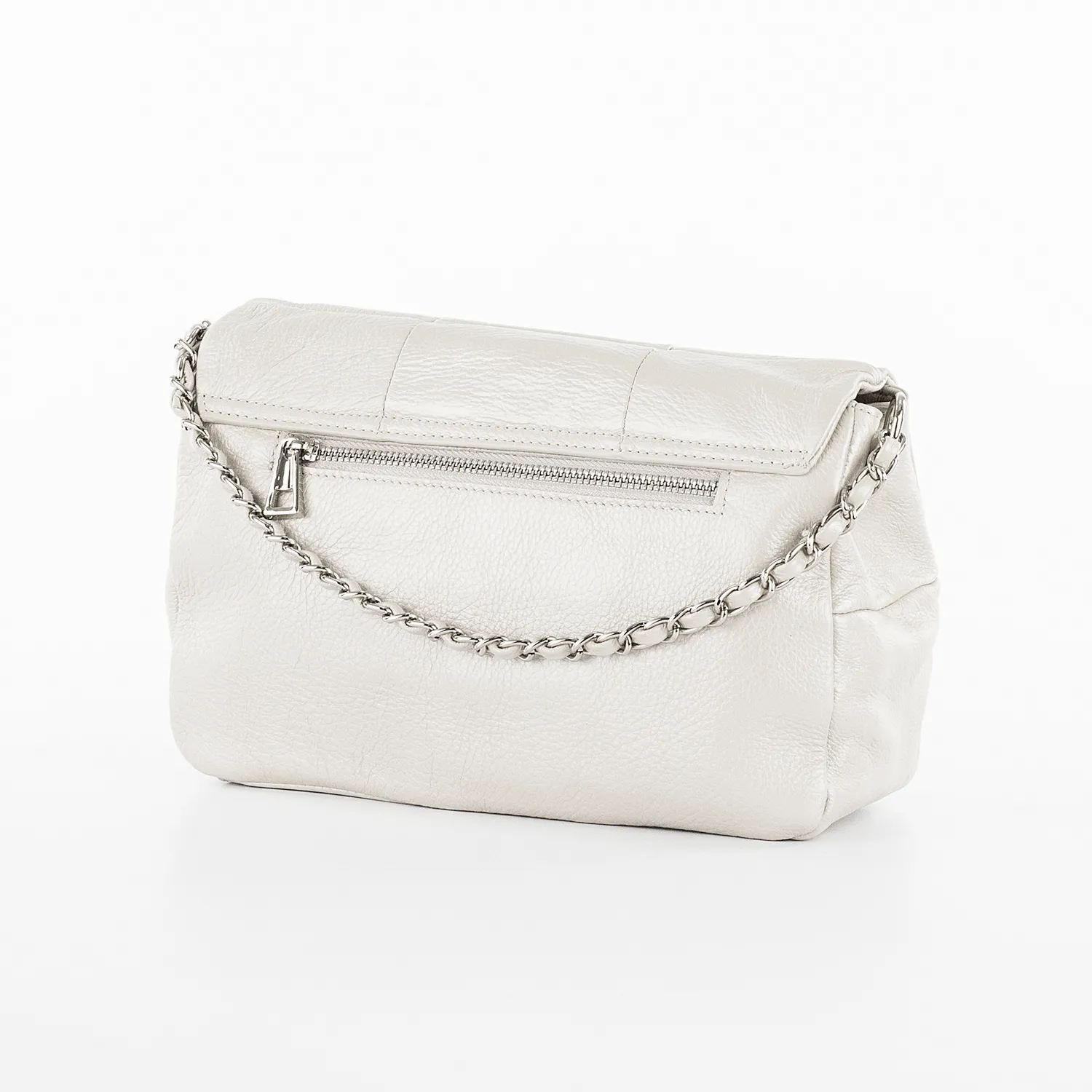 Сумка от торговой марки Poshete из натуральной кожи светло-серого цвета. Модель с одной короткой ручкой-цепочкой, выполняющей также роль декора, и съемным регулируемым плечевым ремнем. Закрывается клапаном на двух магнитных кнопках; клапан декорирован квадратными вставками. Отделение на молнии. Внутри: фирменная подкладка, средник и карман на молнии, два накладных кармана. На задней стороне – карман на молнии.