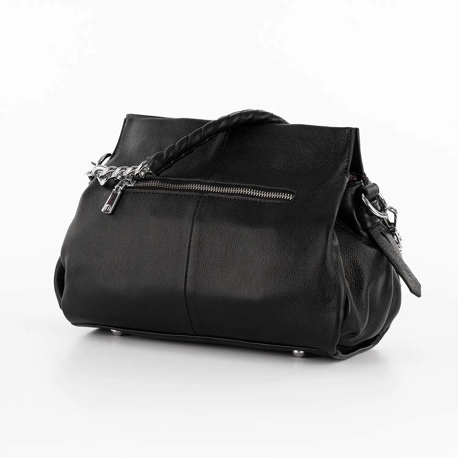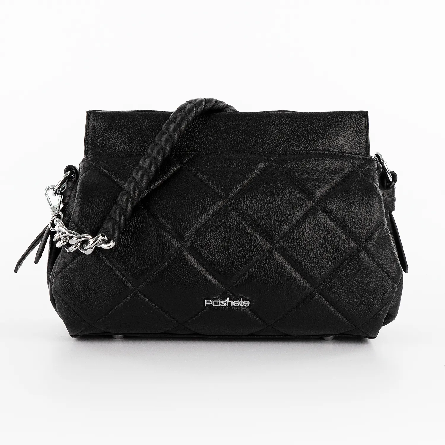 Сумка от торговой марки Poshete из натуральной кожи черного цвета с ромбовидной стежкой. Оригинальная объемная модель со съемной ручкой-цепочкой с кожаной оплеткой и съемным регулируемым плечевым ремнем. Три отделения, с фирменной подкладкой. Крайние фиксируются скрытым магнитом. Среднее отделение на молнии. Внутри: карман на молнии, накладной карман. На задней стороне – карман на молнии. Дно оснащено металлическими ножками для защиты от износа.