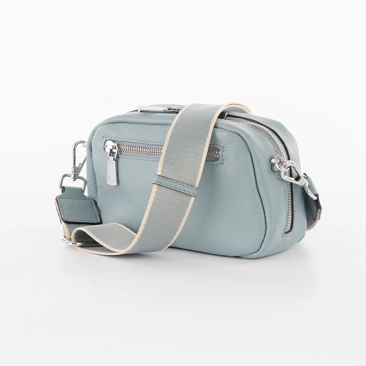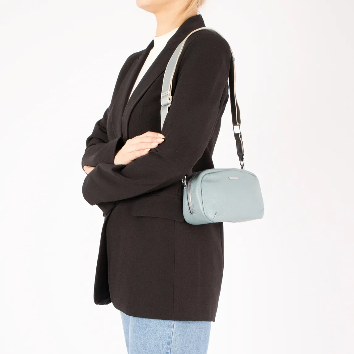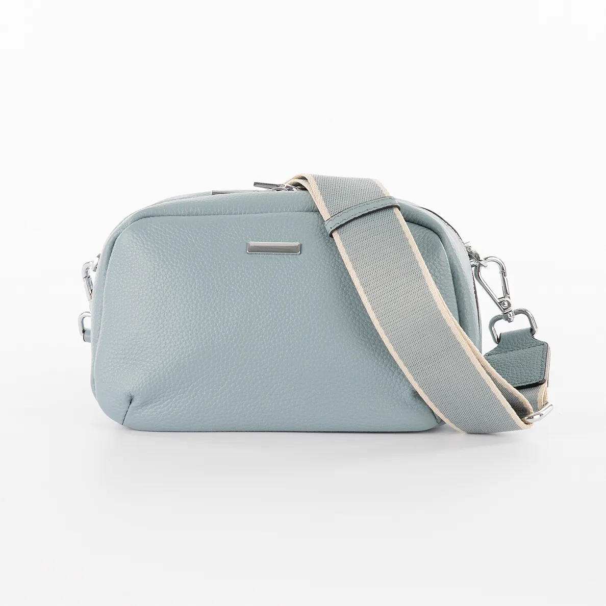 Сумка от торговой марки Poshete из натуральной кожи голубого цвета. Компактная модель с широким съемным регулируемым плечевым ремнем, выполненным из текстильного материала. Отделение на молнии с двумя встречными бегунками. Внутри: фирменная подкладка, карман на молнии, накладной карман, перегородка с карманом на молнии, образующая накладной карман. На задней стороне – карман на молнии.
