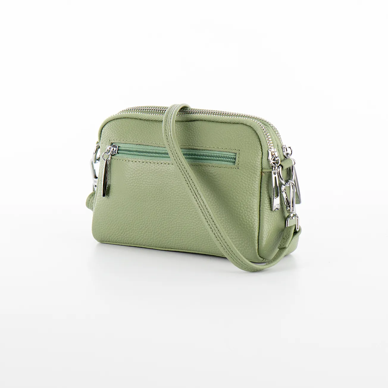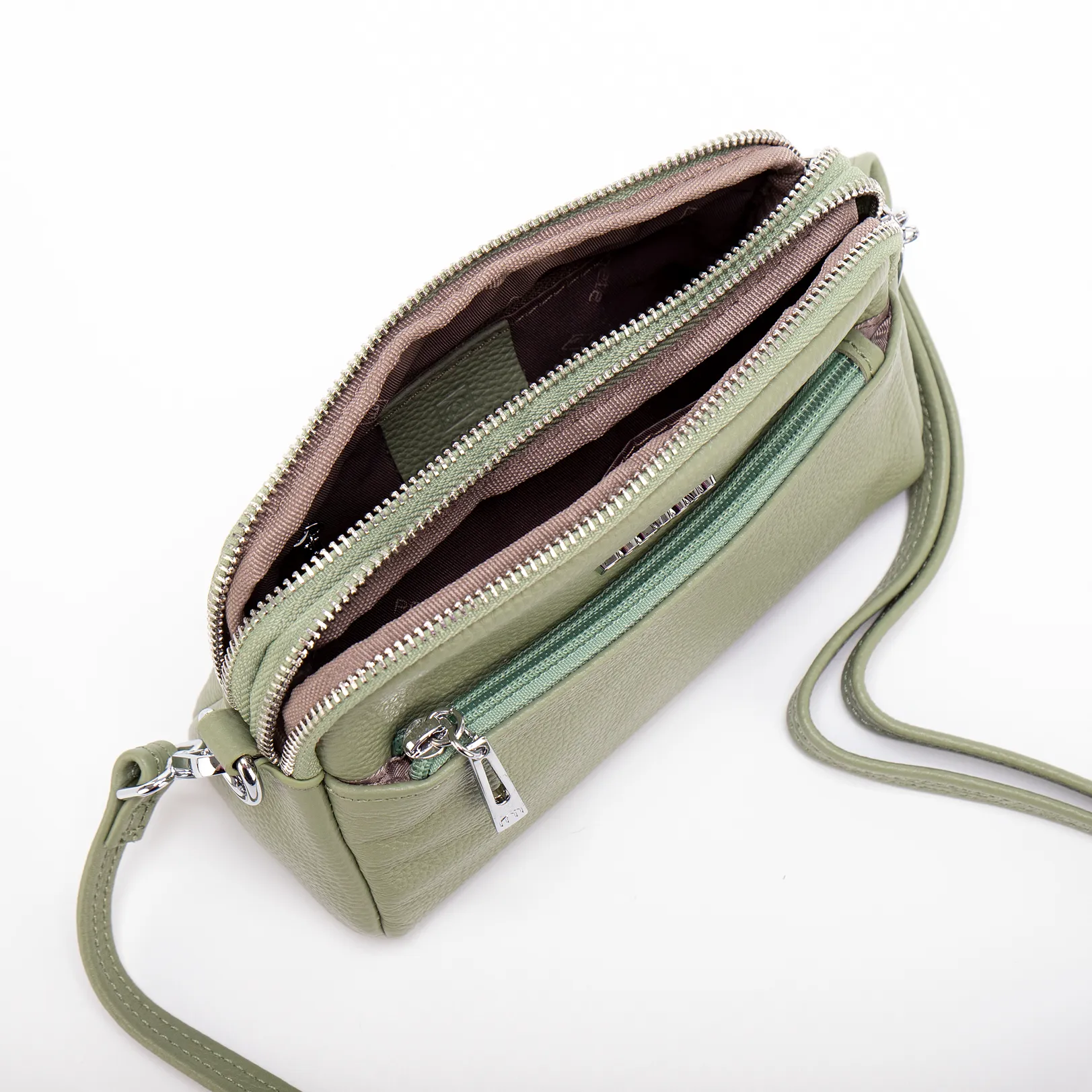 Сумка-планшет от торговой марки Poshete из натуральной кожи светло-зеленого цвета. Компактная модель со съемным регулируемым плечевым ремнем. Два отделения на молнии, с фирменной подкладкой. В заднем - карман на молнии, в переднем – накладной - карман. На лицевой и задней сторонах – карман на молнии.