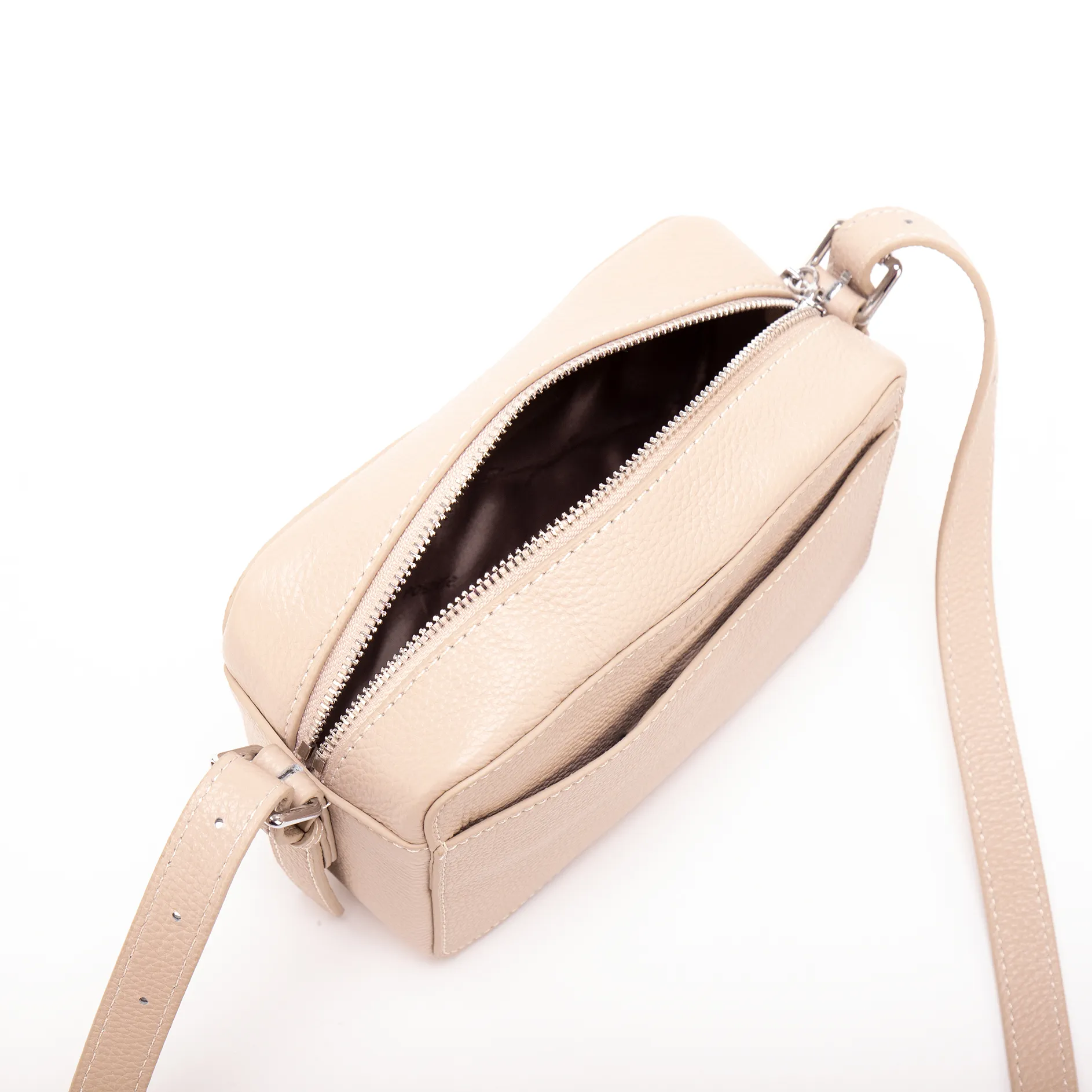 Сумка-планшет от торговой марки Poshete из натуральной кожи светло-бежевого цвета. Компактная полужесткая модель в форме короба с несъемным регулируемым плечевым ремнем. Отделение на молнии. Внутри: фирменная подкладка, кожаный накладной карман для карт. На лицевой стороне – накладной карман на скрытом магните.