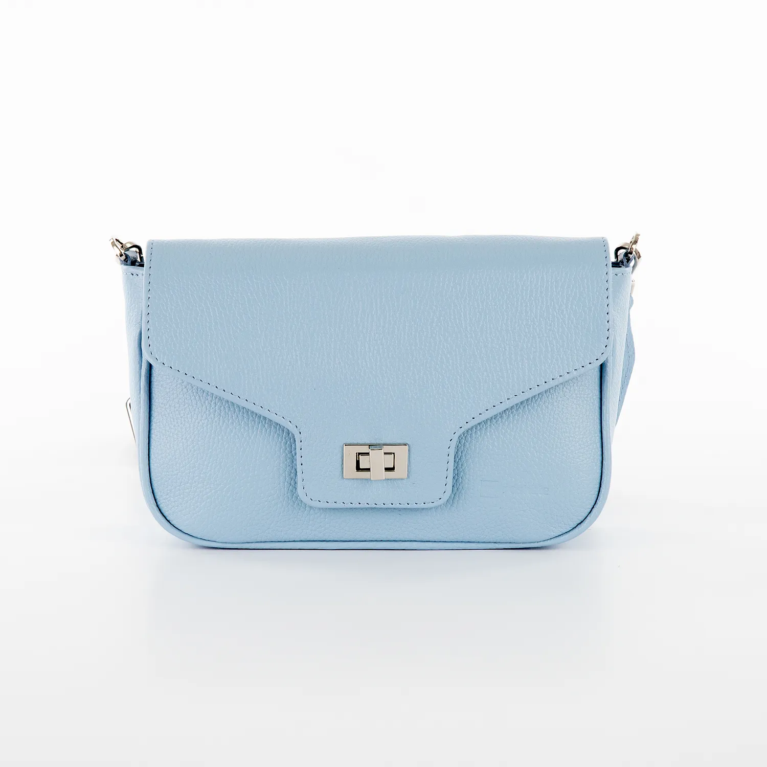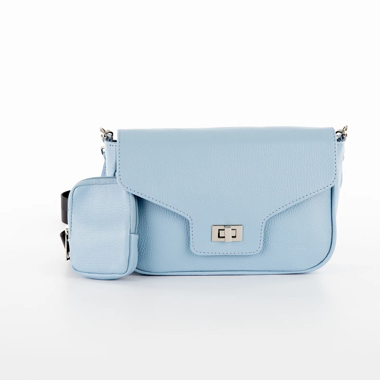 Сумка кросс-боди от торговой марки Poshete из натуральной кожи голубого цвета. Модель с широким съемным регулируемым плечевым ремнем, выполненным из текстильного материала с колечком, к которому крепится кошелек; кошелек с отделением на молнии, без подкладки. Сумка закрывается клапаном на поворотном замке. В отделении: фирменная подкладка, два кармана на молнии.