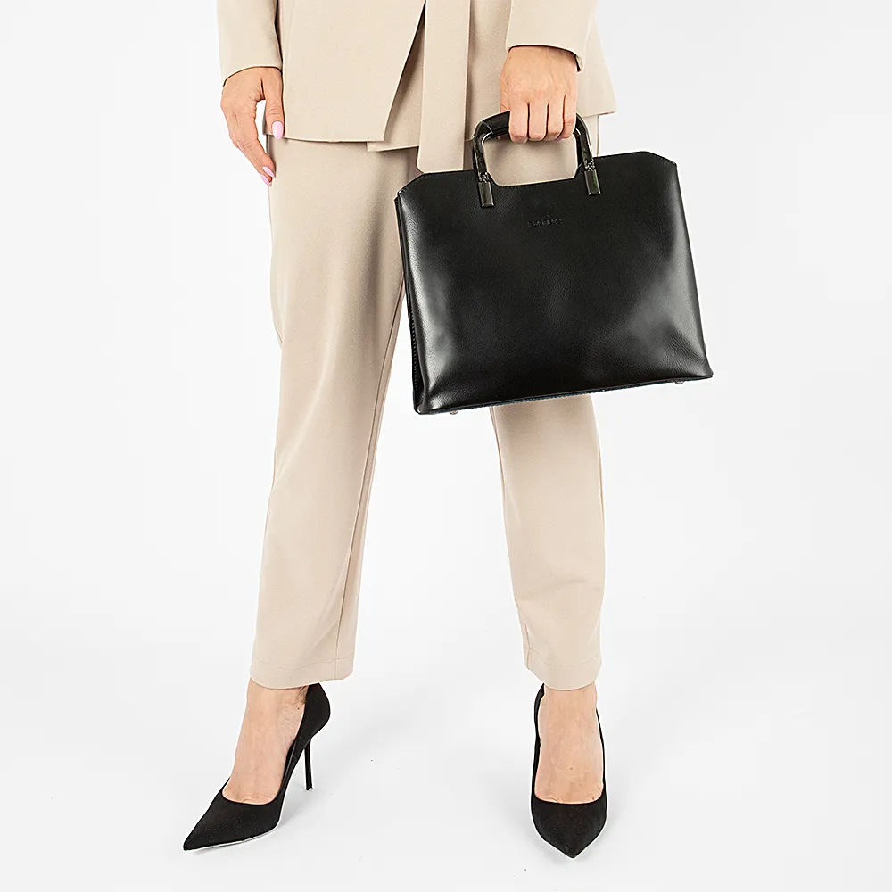 Сумка от торговой марки Poshete из натуральной кожи черного цвета. Модель с двумя металлическими ручками с кожаной накладкой, съемным плечевым ремнем. Три отделения с частичной подкладкой. Крайние фиксируются кнопкой. Среднее отделение на молнии. Внутри: средник и карман на молнии, накладной карман. Дно оснащено ножками для защиты от износа.