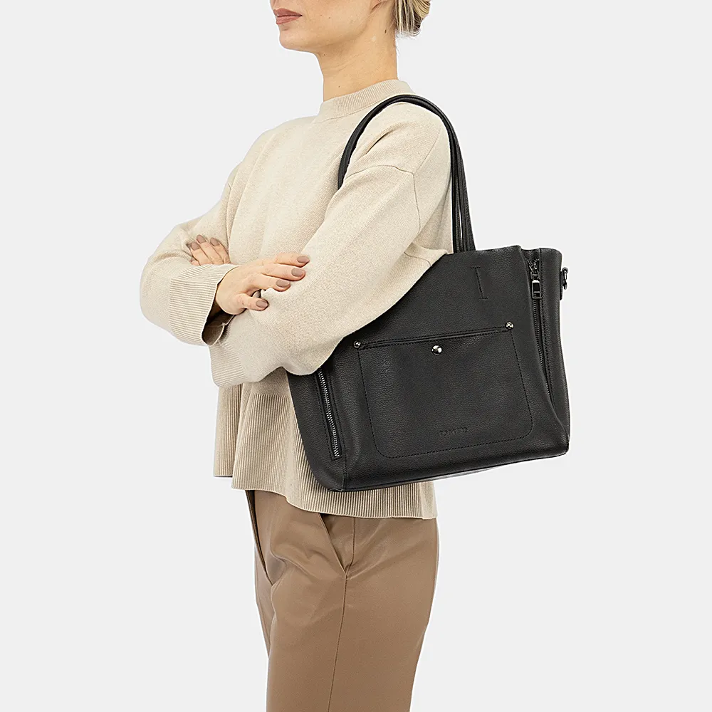 Сумка от торговой марки Poshete выполнена из натуральной кожи черного цвета. Модель с двумя ручками и съемным плечевым ремнем. Отделение на молнии. Внутри: фирменная подкладка, средник и карман на молнии, два накладных кармана. На лицевой стороне – накладной карман на кнопке. На задней стороне – карман на молнии. По бокам с обеих сторон имеются декоративные молнии.
