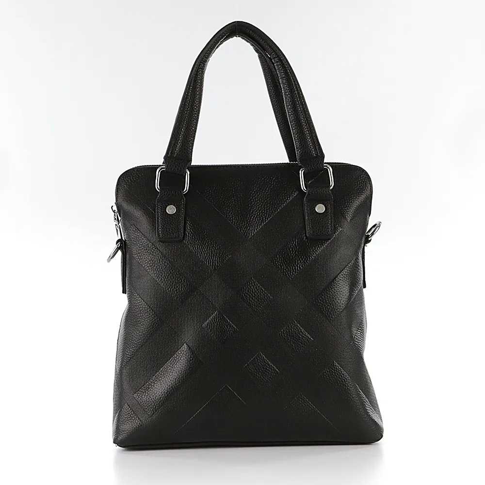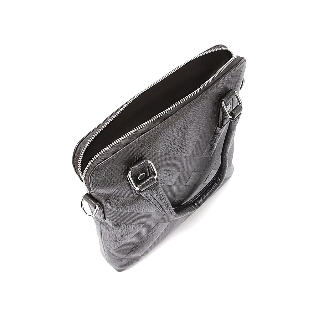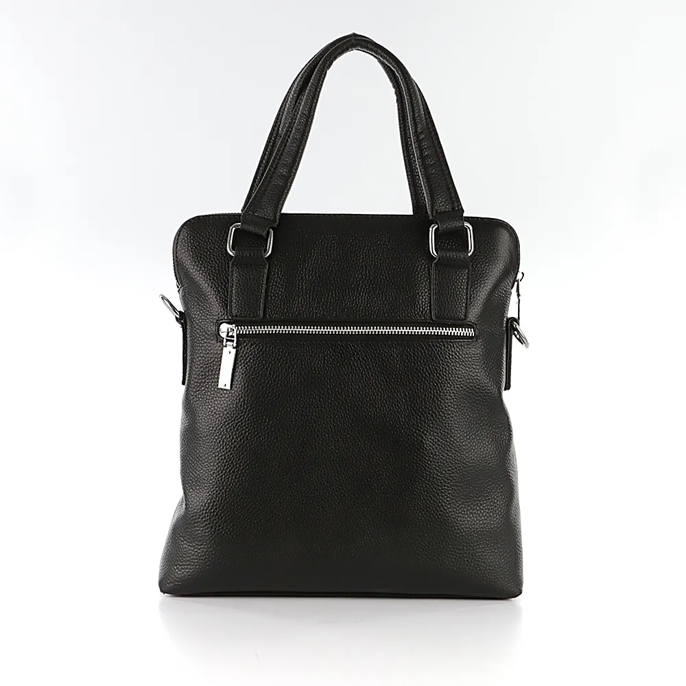 Сумка от торговой марки Poshete из натуральной кожи черного цвета. Лицевая сторона декорирована оригинальным блинтовым тиснением. Плоская модель вертикальной ориентации с двумя ручками и съемным регулируемым плечевым ремнем, выполненным из текстильного материала. Отделение на молнии. Внутри: фирменная подкладка, карман на молнии, два накладных кармана. На задней стороне – карман на молнии.