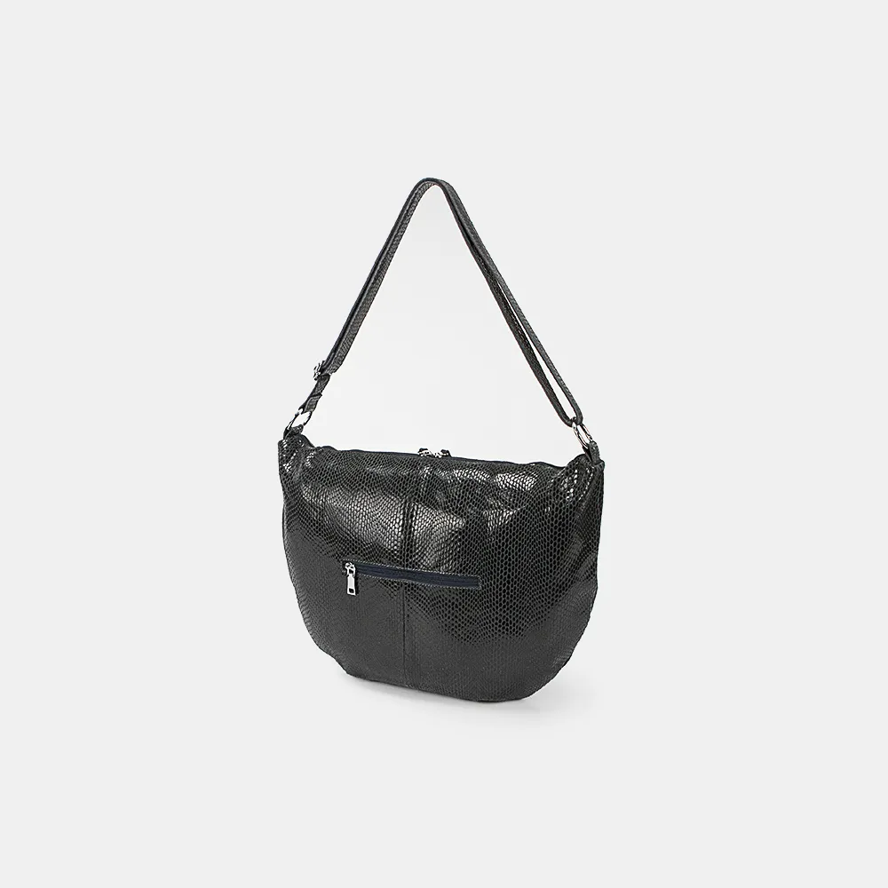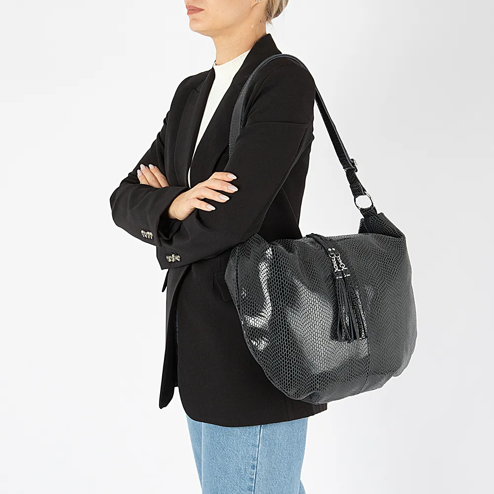 Сумка от торговой марки Poshete из натуральной кожи с лазерной обработкой в темно-сером цвете с тиснением под змеиную кожу. Модель с регулируемым ручкой-ремнем с декоративной подвеской-кисточкой. Отделение на молнии. Внутри: текстильная подкладка, средник и карман на молнии, накладной карман. На задней стороне – карман на молнии.