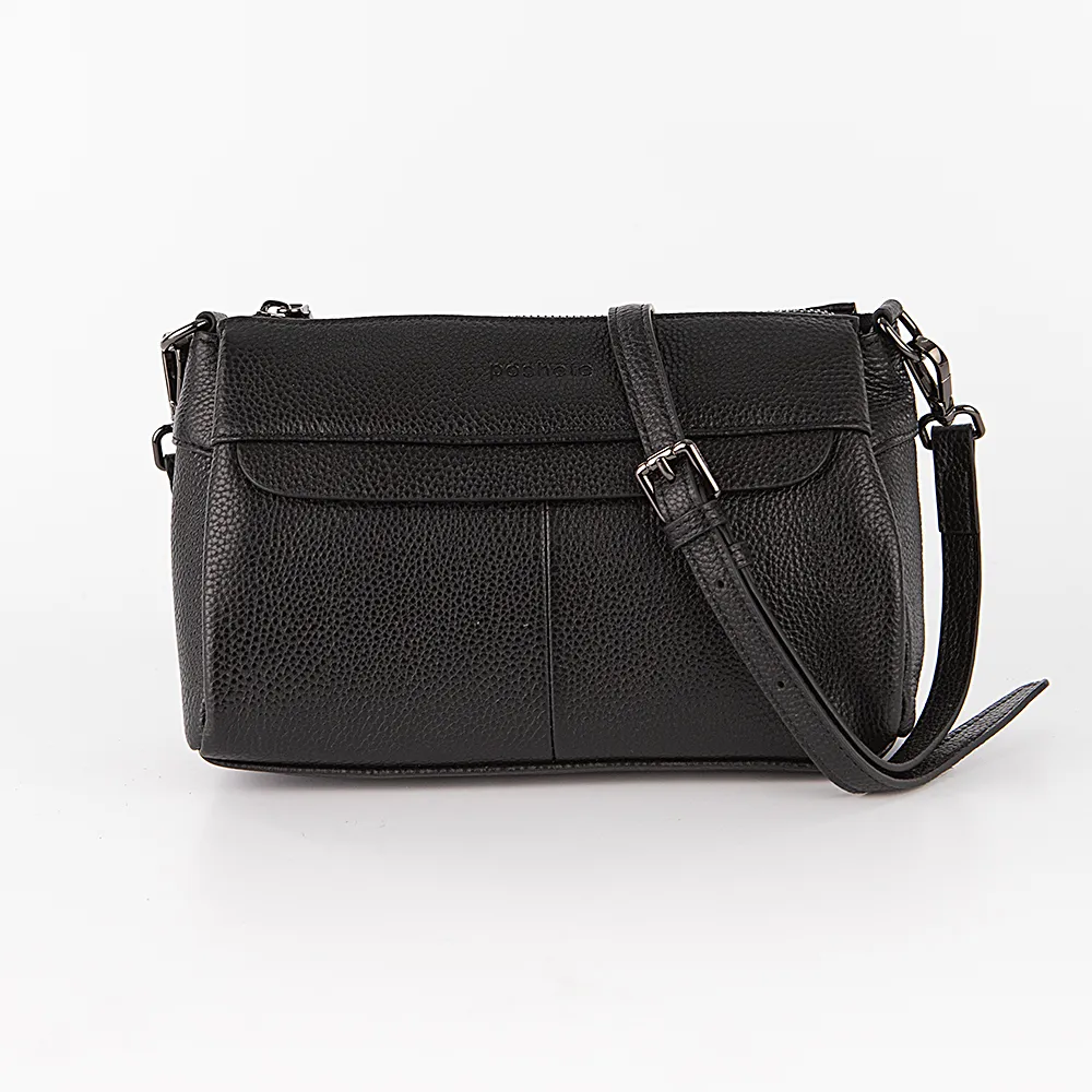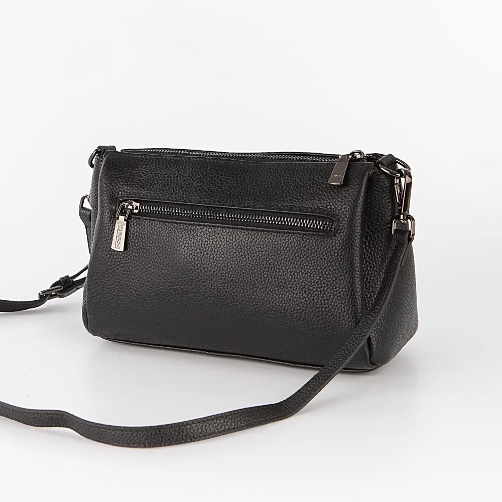 Сумка от торговой марки Poshete из натуральной кожи черного цвета. Модель со съемным регулируемым плечевым ремнем. Закрывается молнией; широко раскрывается. Внутри: три отсека с фирменной подкладкой; в среднем – карман на молнии. На задней стороне – карман на молнии.